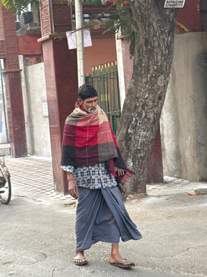 An elderly man walks barefoot on a paved path. He wears a plaid shawl draped over a checkered shirt and blue, draped trousers. A large tree trunk is visible in the background along with a building and…read more