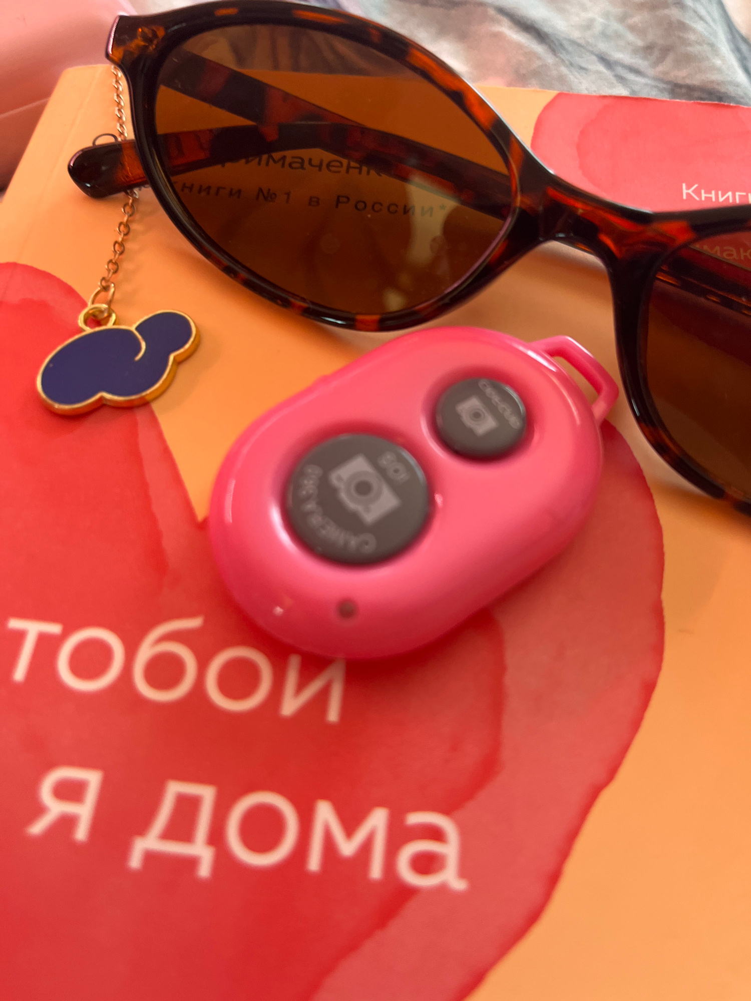 The image presents a still-life composition featuring various items resting on a peach-colored surface. The primary objects include a pair of tortoiseshell sunglasses, a pink, oval-shaped remote with…read more