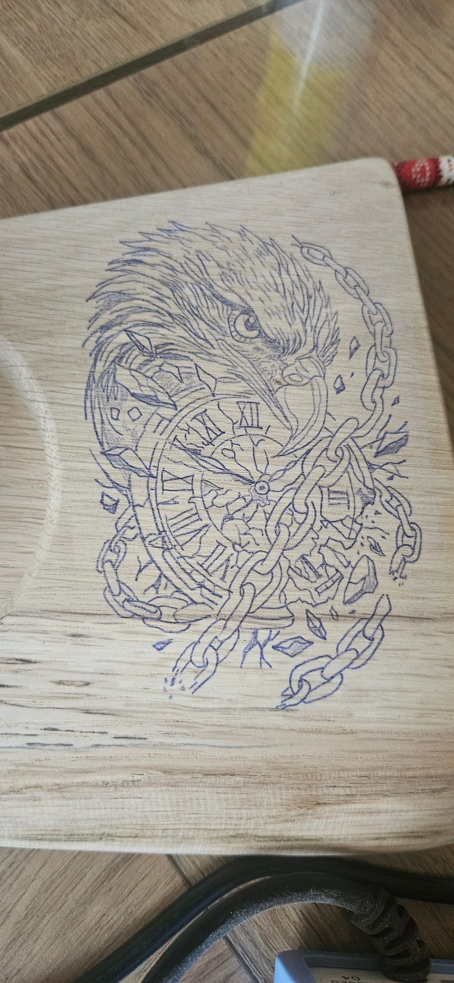 The image shows a close-up of a wooden surface with an etched design. The design features a stylized eagle's head, an antique clock face with Roman numerals, and a broken chain. The clock face appears…read more