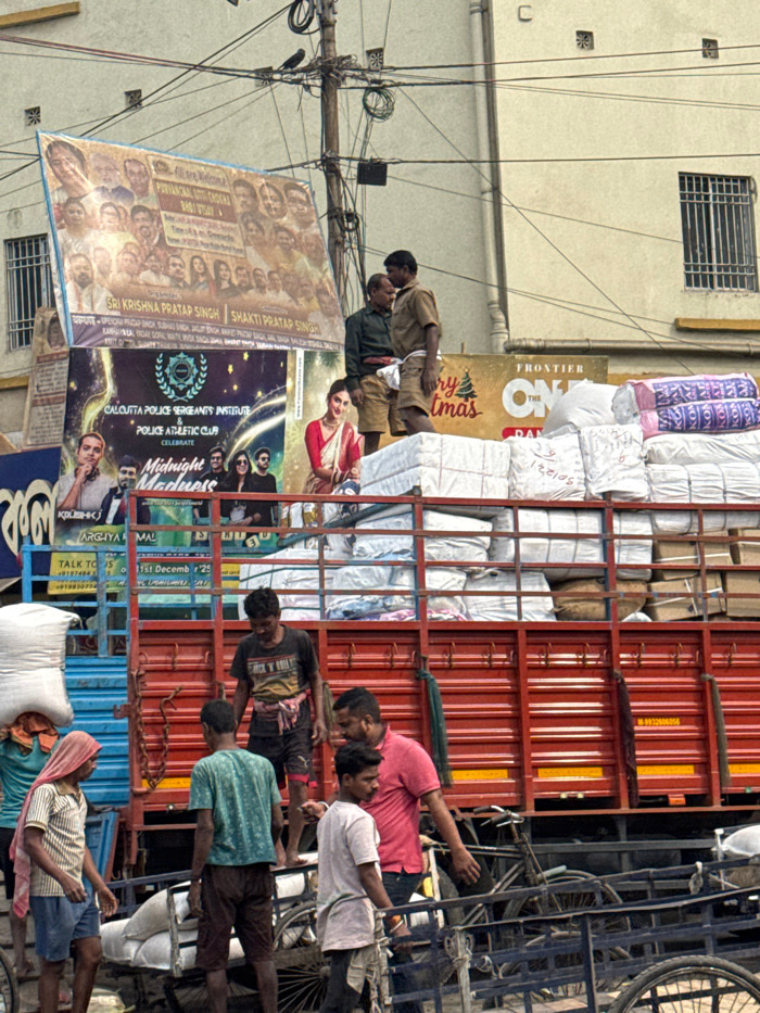 A busy street scene features multiple advertisements and people. A large red truck is loaded with white sacks, possibly goods for sale. Several men are working or riding on the truck. Underneath the t…read more