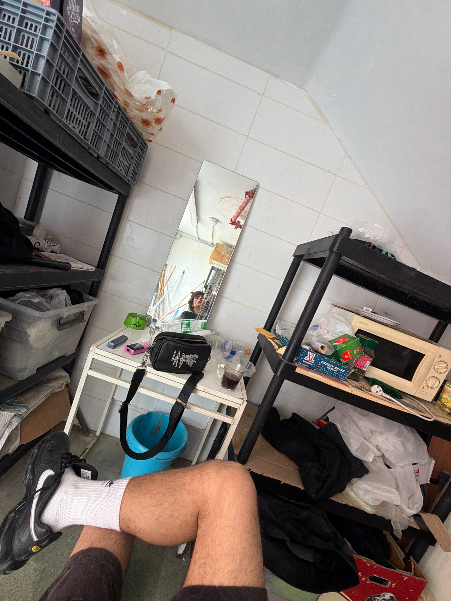 The image presents an indoor scene captured from a low, tilted angle, looking across a cluttered room. The floor is laid with light-colored square tiles, and the walls are similarly light. In the for…read more