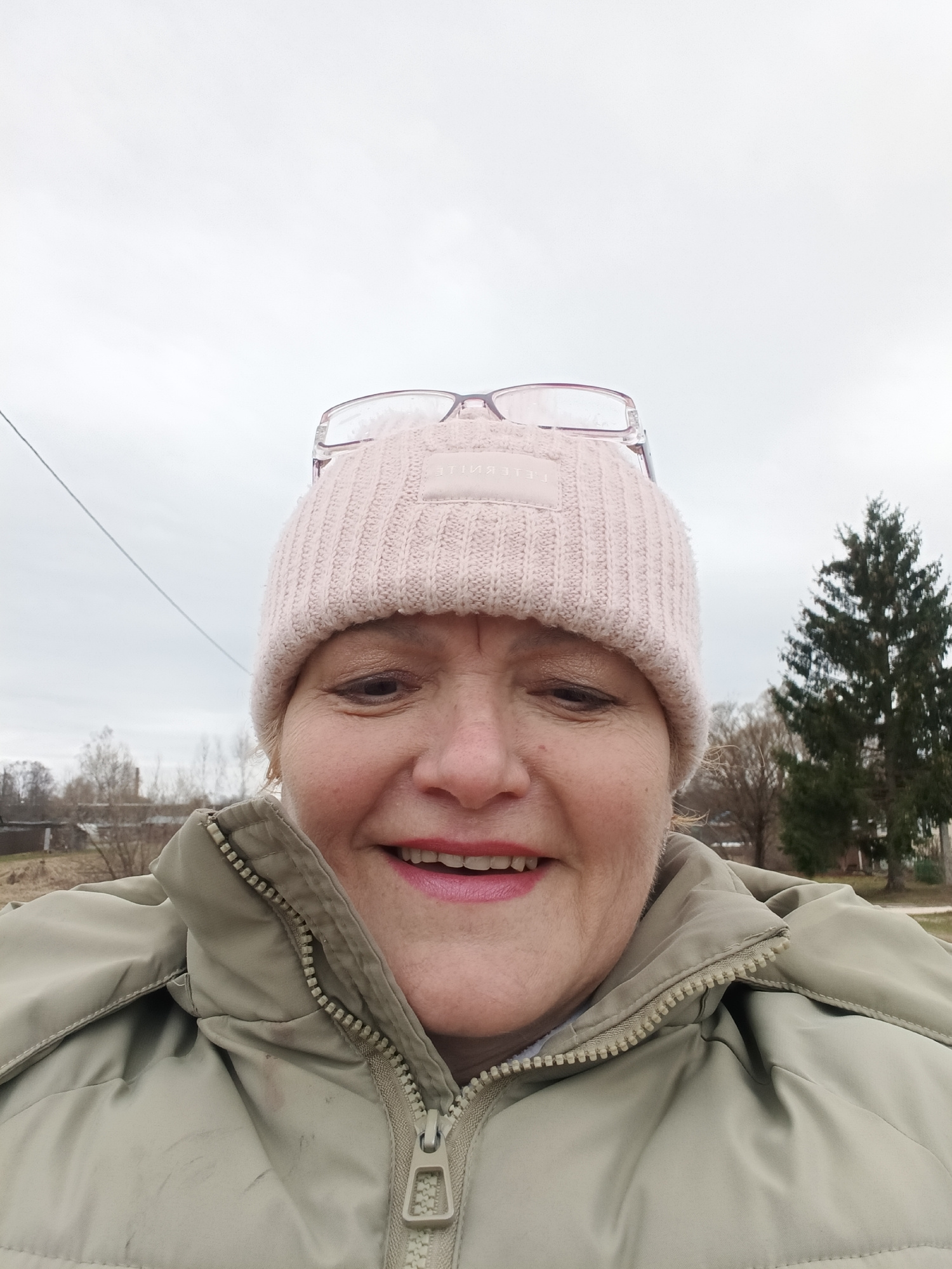 A woman is taking a selfie outdoors. She is wearing a light pink beanie with glasses perched on top, a khaki jacket, and lipstick. The background includes overcast skies, leafless trees, some low-lyin…read more