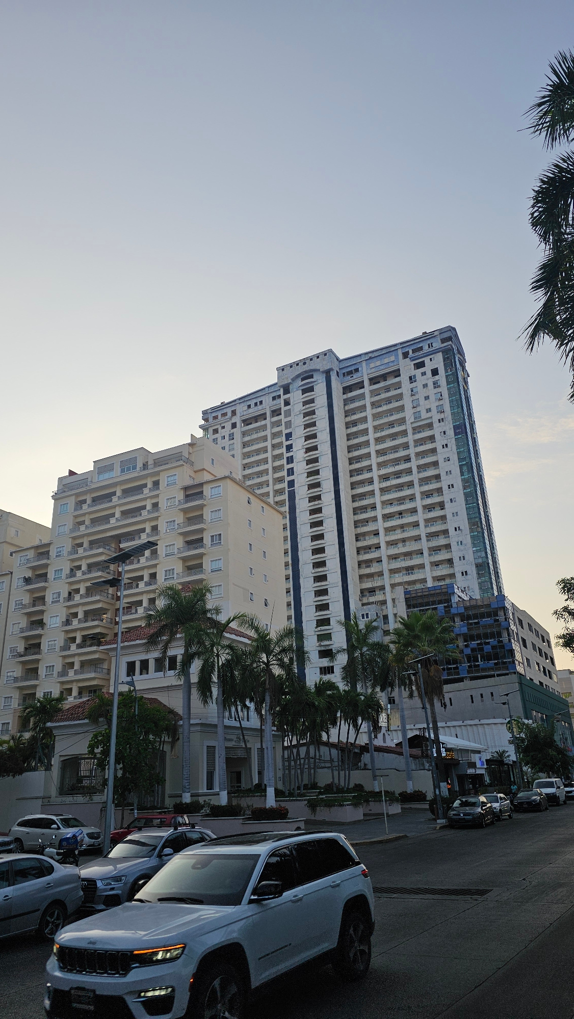 The image shows a street scene in Acapulco, Mexico. Several tall buildings are visible, appearing to be residential or commercial properties with multiple floors and balconies. Palm trees line the strβ¦read more