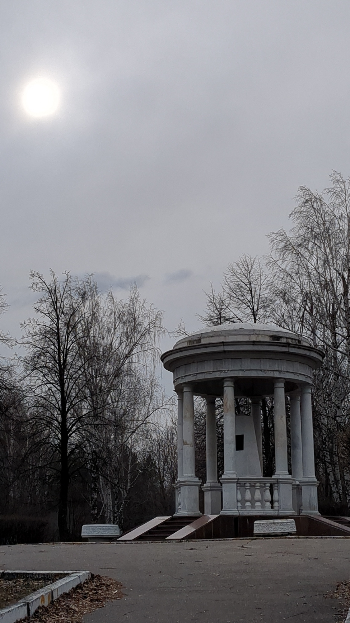 The image shows a rotunda in Ulyanovsk, Russia. The structure is made of gray stone and consists of a circular base, columns, and a dome-shaped roof. Bare trees surround the rotunda. To the right, the…read more