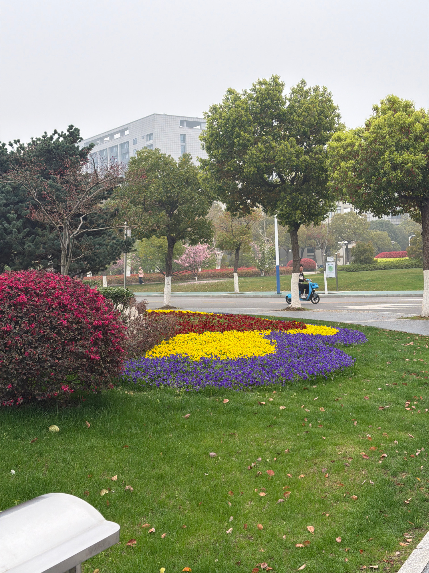 A park scene in Jiangning District, China, features a lawn with scattered leaves adjacent to a paved pathway. A flowerbed arranged in vertical stripes of purple, yellow, and red sits beside the pathwa…read more
