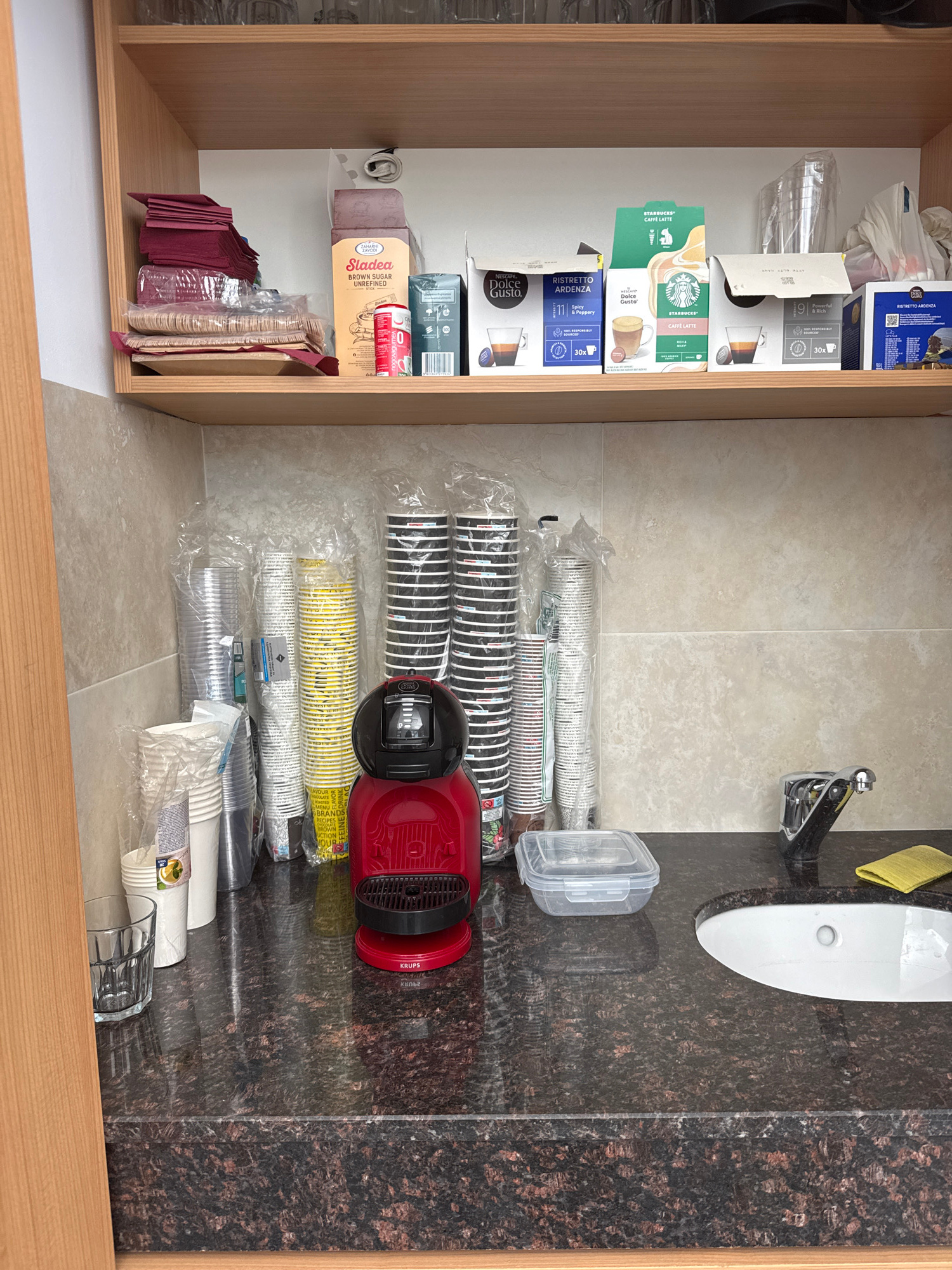 The image shows the inside of a drawer, likely in a kitchen or kitchenette setting. The drawer is filled with various items including coffee capsules from brands like Dolce Gusto and Starbucks, cups,…read more