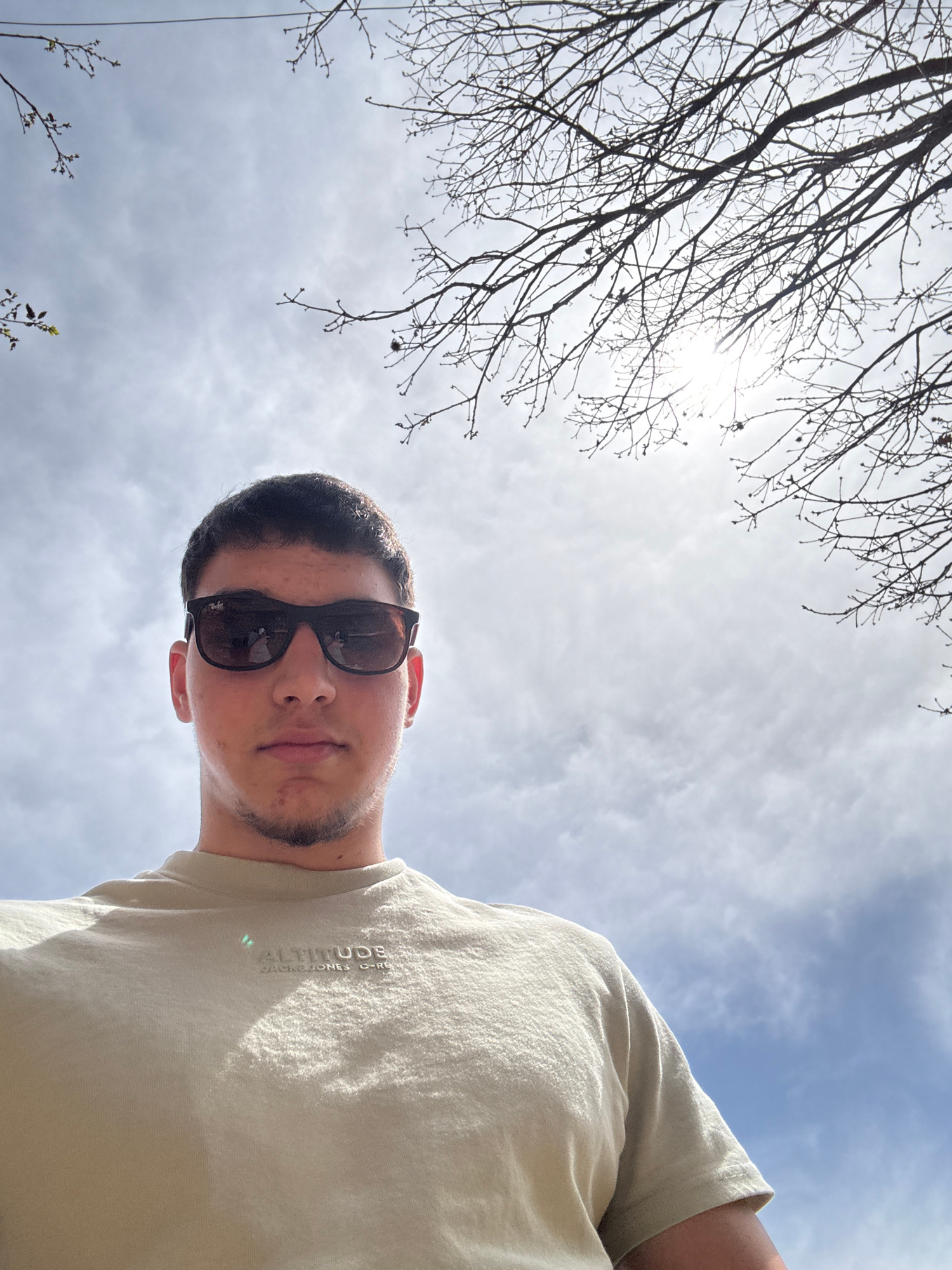 A low-angle, upward-facing shot captures a young adult male on the right side of the frame, set against a bright, cloudy sky with bare tree branches. The subject, seen from the chest up, has short darβ¦read more