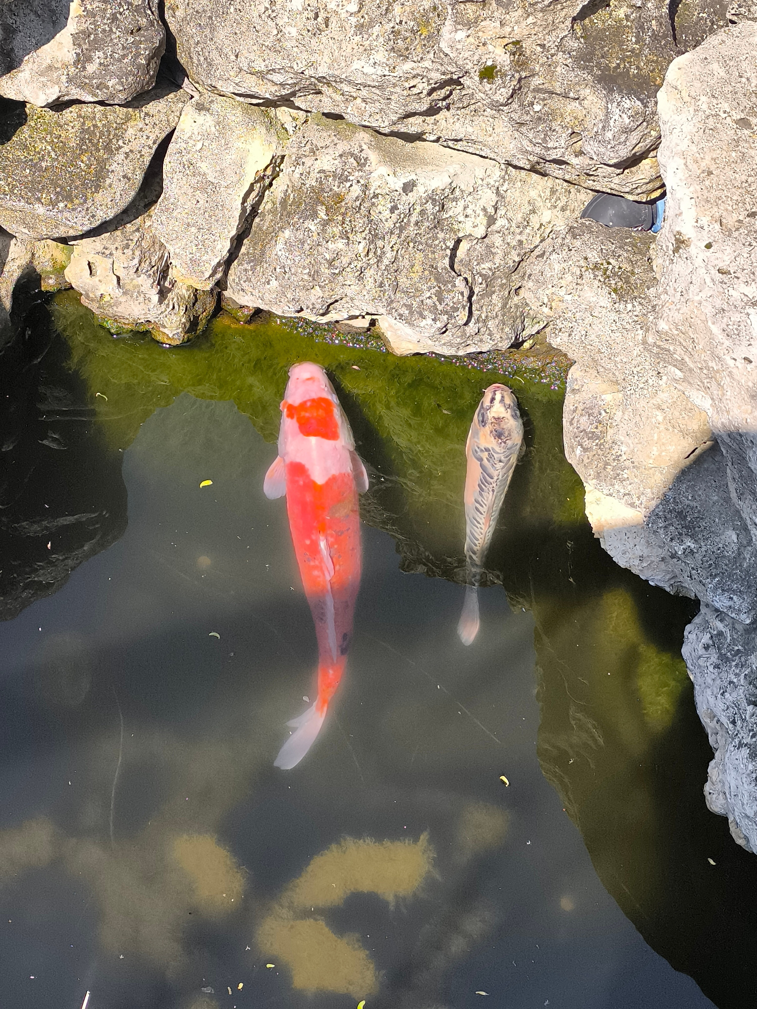 An overhead photograph captures two large fish, likely Koi, swimming in a rocky pond under bright sunlight. A prominent red and white Koi, with striking crimson markings on its head and body against a…read more