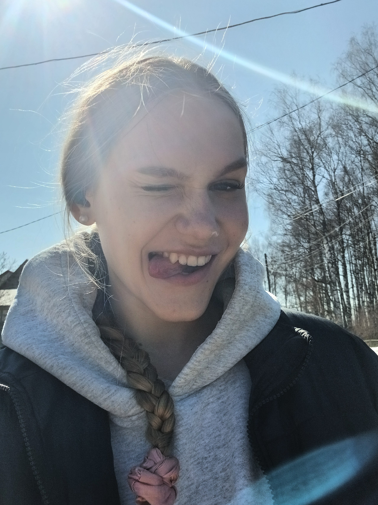 A young woman is captured in a playful outdoor selfie taken at a tilted angle, against a backdrop of a bright, sunny sky and bare trees. She has light brown hair styled in a single braid, secured with…read more