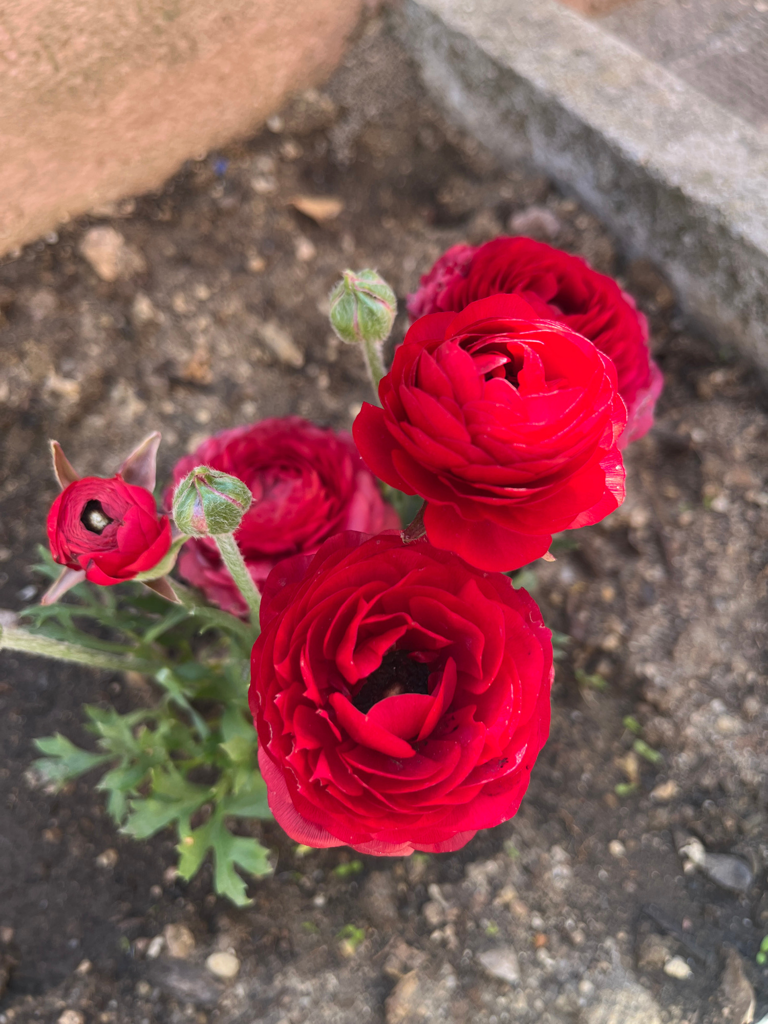 The image shows a close-up view of red Ranunculus flowers planted in a garden bed. The soil appears dark and fertile. The location in Kulata, Bulgaria cannot be confirmed from visual evidence.