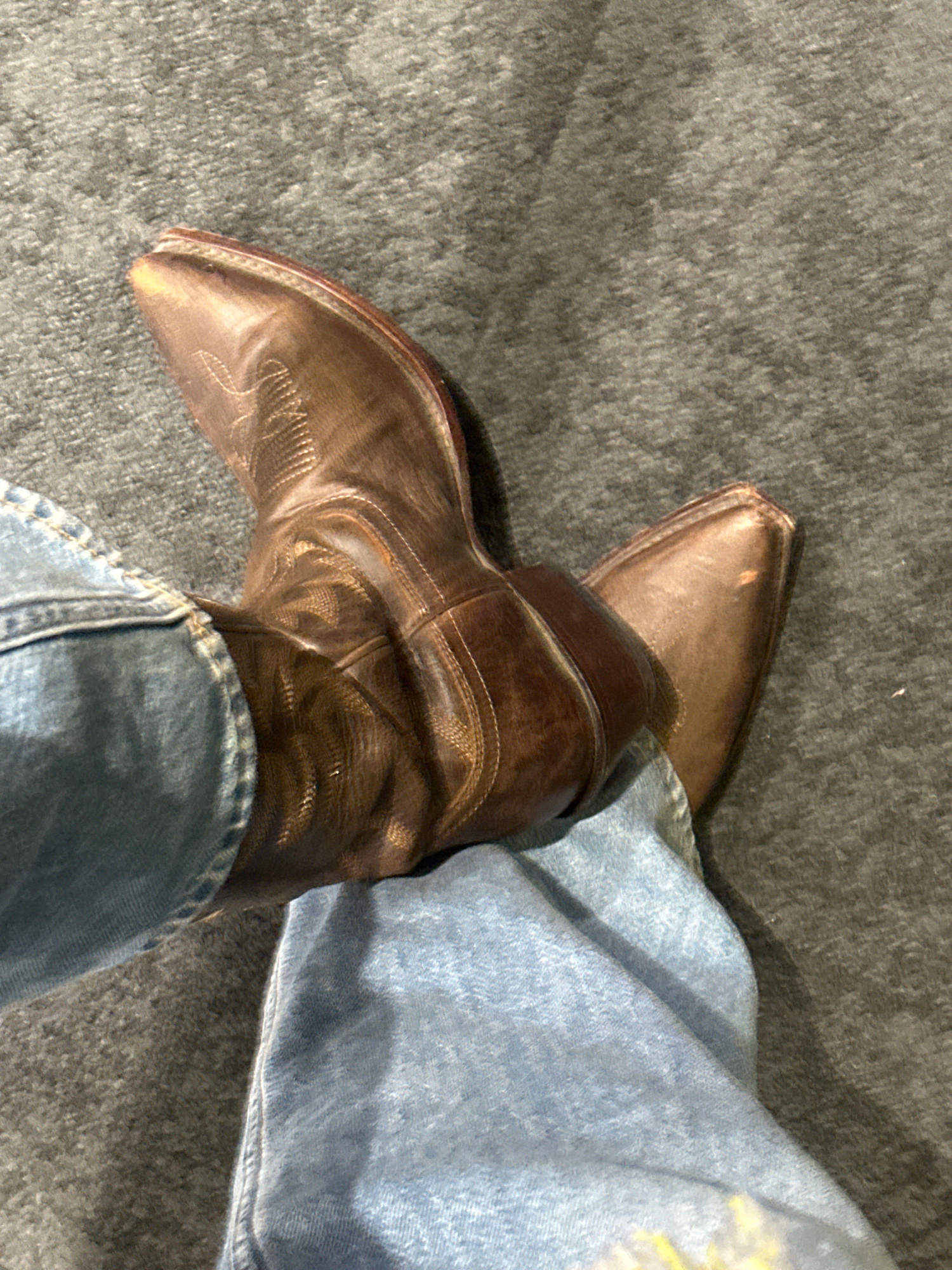 A close-up, high-angle shot shows a pair of brown leather cowboy boots being worn with blue denim jeans. The boots are pointed-toe with detailed stitching. The jeans appear worn. The surface below the…read more