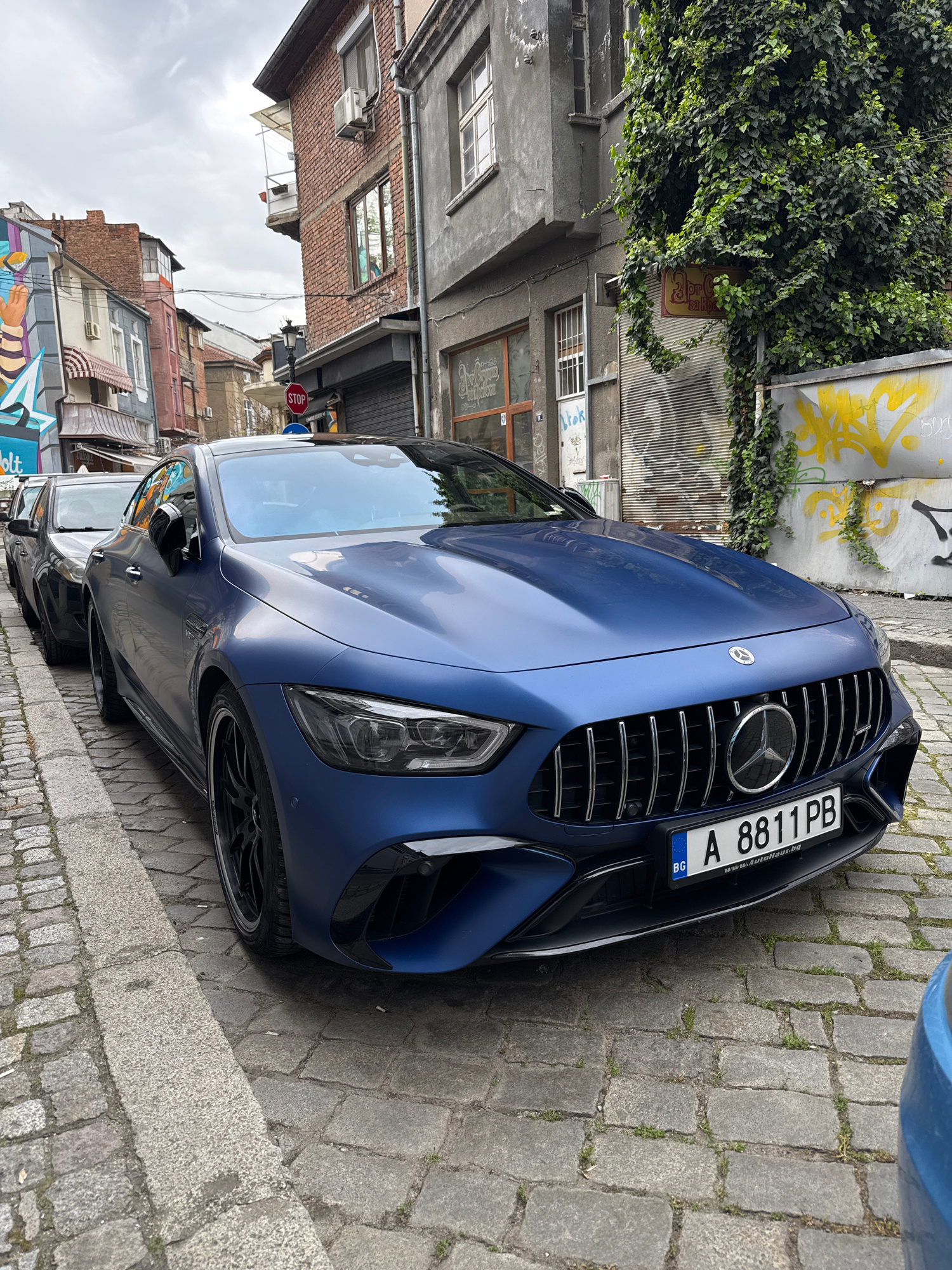 A blue Mercedes-Benz, likely an AMG model with a satin or matte finish, is parked on a cobblestone street in Plovdiv, Bulgaria. The front of the car is angled towards the viewer, showcasing its promin…read more