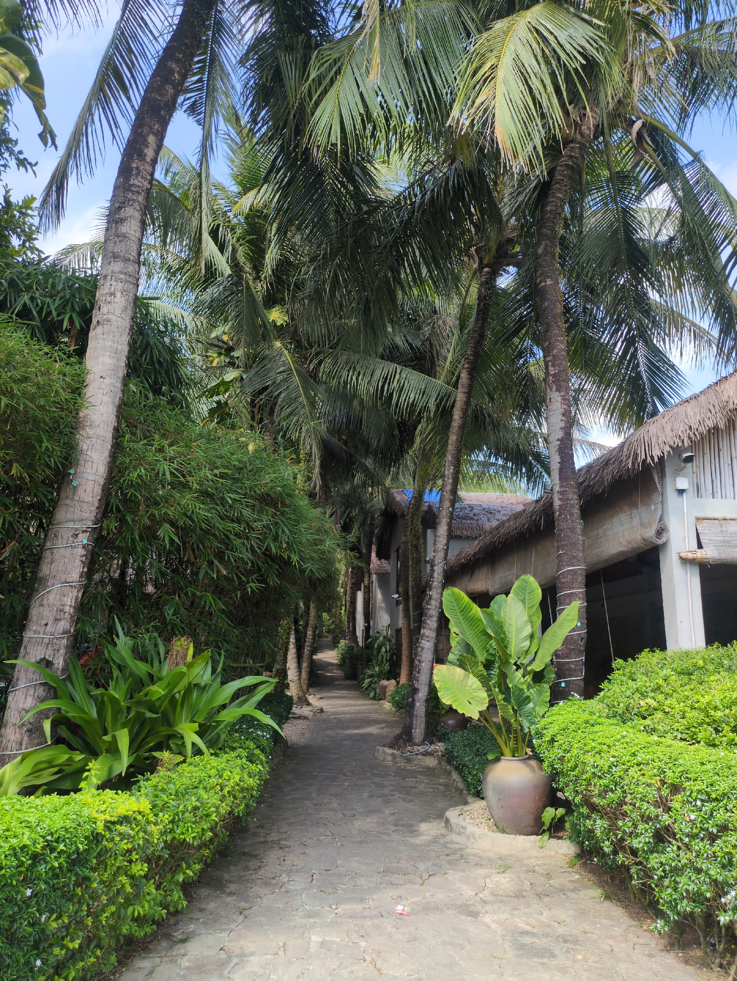 The image shows a pathway in a tropical location. The pathway is made of uneven stone and is bordered by lush green vegetation on both sides. Palm trees are prominent, arching over the pathway and pro…read more