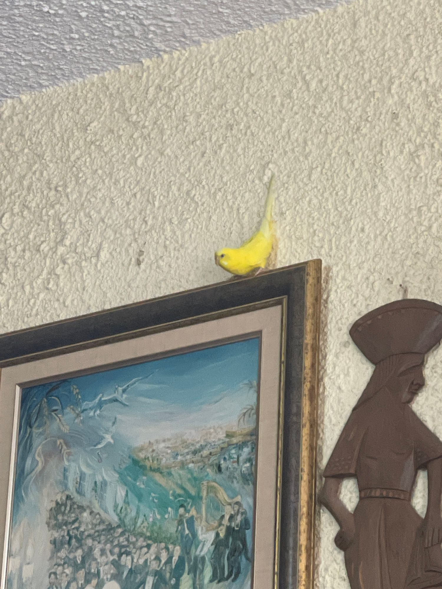 A yellow parakeet rests on a textured wall next to a framed painting of a seascape. Above the painting is a dark brown wooden carving of a figure. The location is Petah Tikva, Israel.