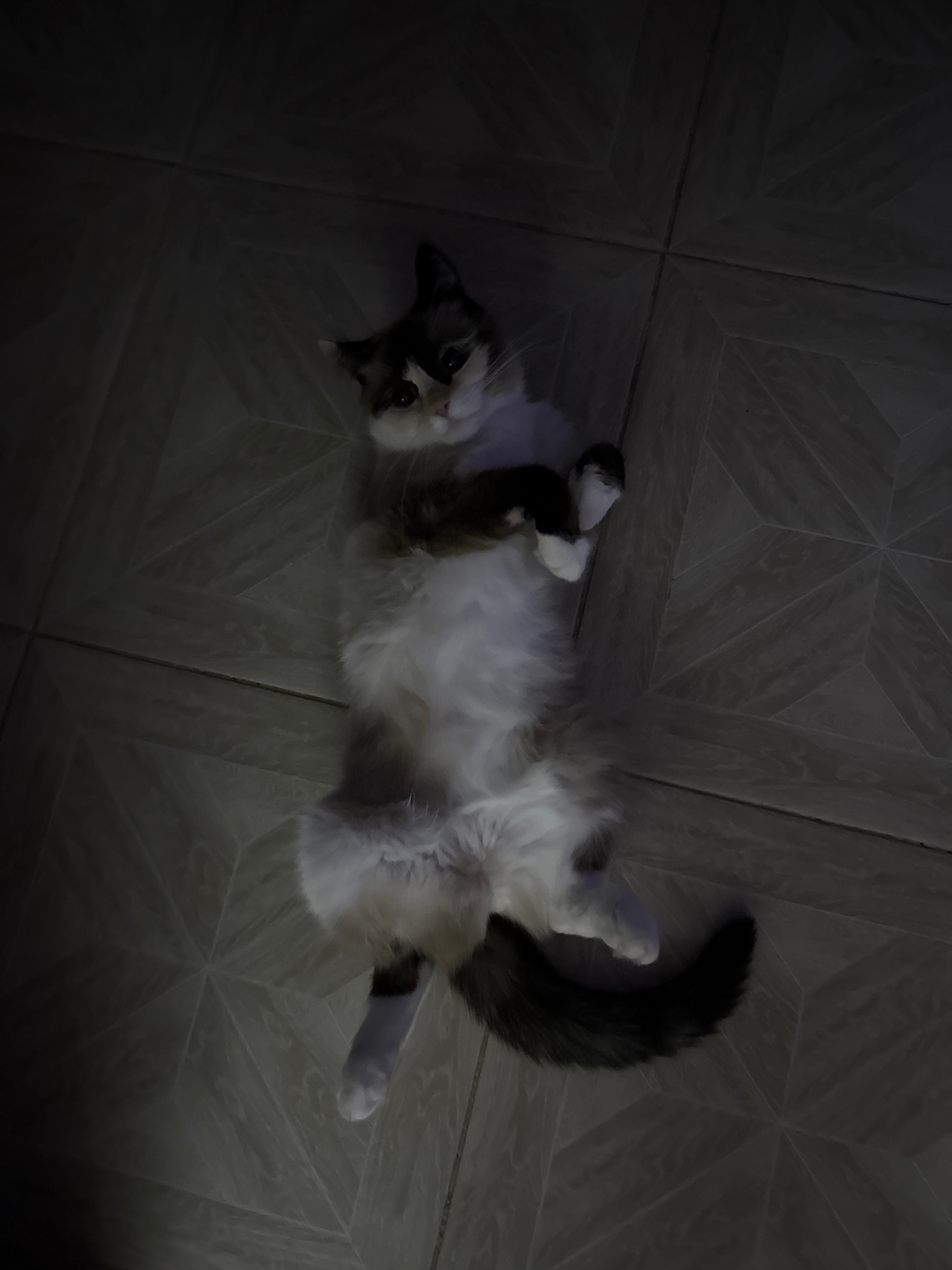 A cat is lying on its back on a tiled floor. The cat is mostly white with dark patches on its face and tail. The floor is made of large, square tiles arranged in a geometric pattern. The location is i…read more