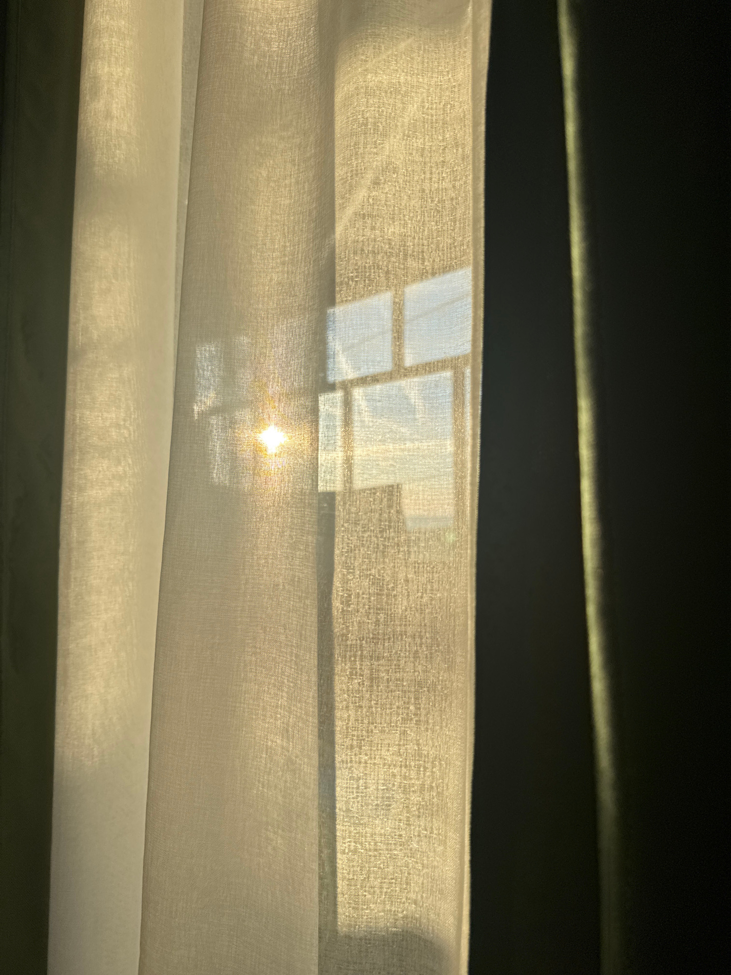 The image shows a close-up view of a window with sheer white curtains. Sunlight shines through the window, creating a bright reflection on the curtain fabric. The window frame is visible through the c…read more