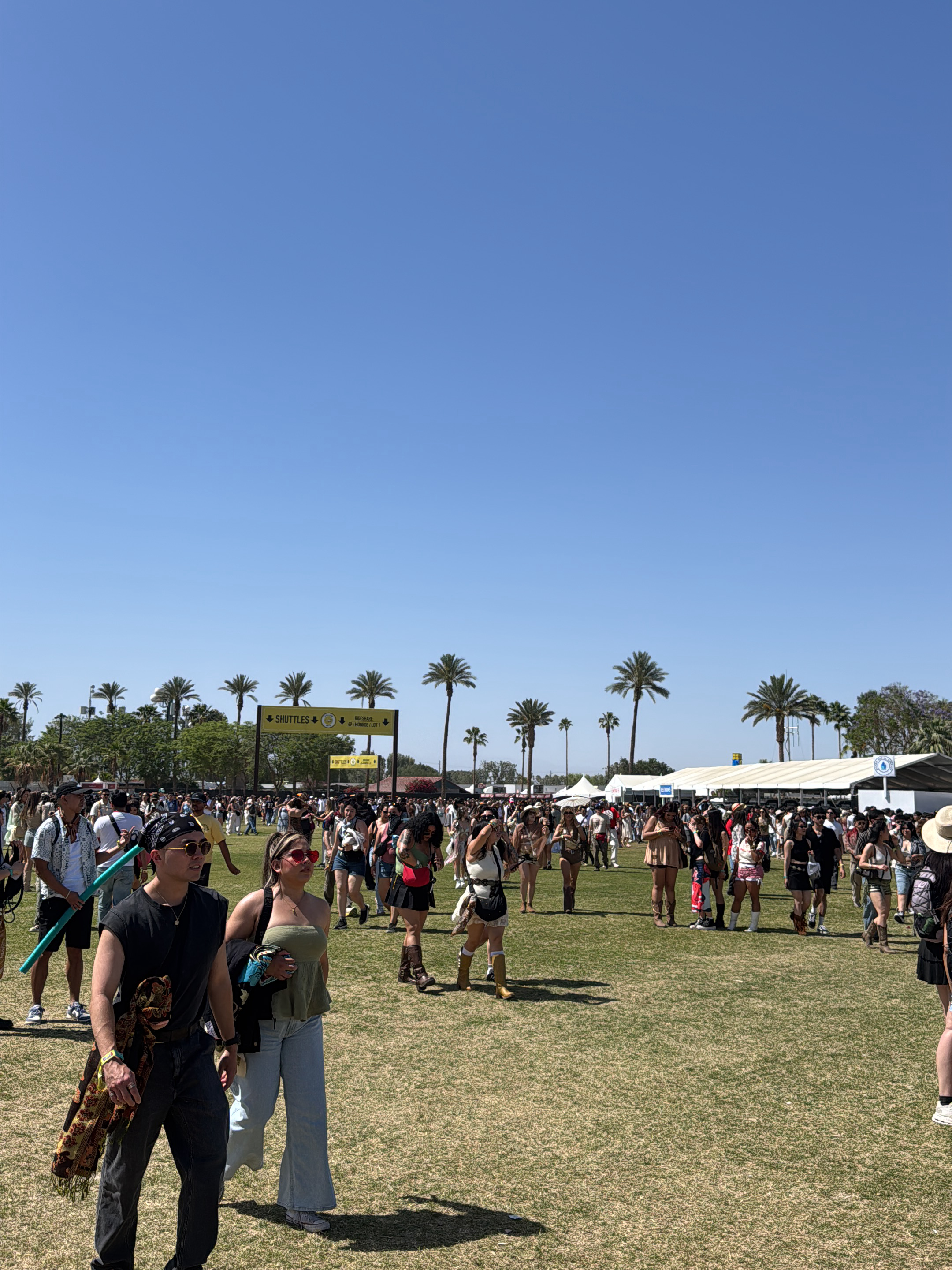 The image depicts a large crowd of people on a grassy field under a clear blue sky. Several palm trees are visible in the background, as well as tents and signs. A sign indicating "Shuttles" and arrow…read more