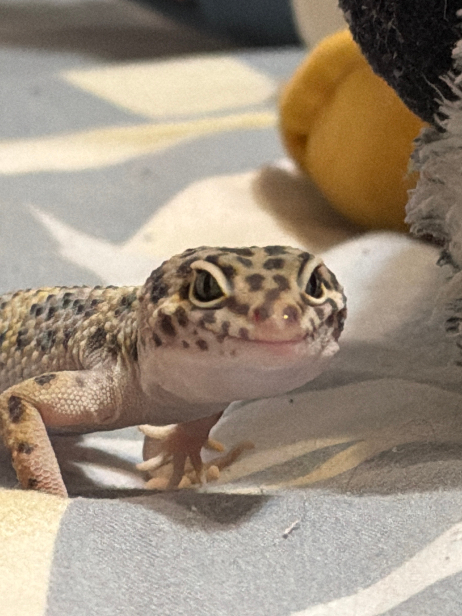 A spotted gecko is clinging to a fabric surface. The gecko's head is prominent in the foreground, displaying its spotted pattern and closed eyelids. A yellow, rounded object is visible in the upper le…read more