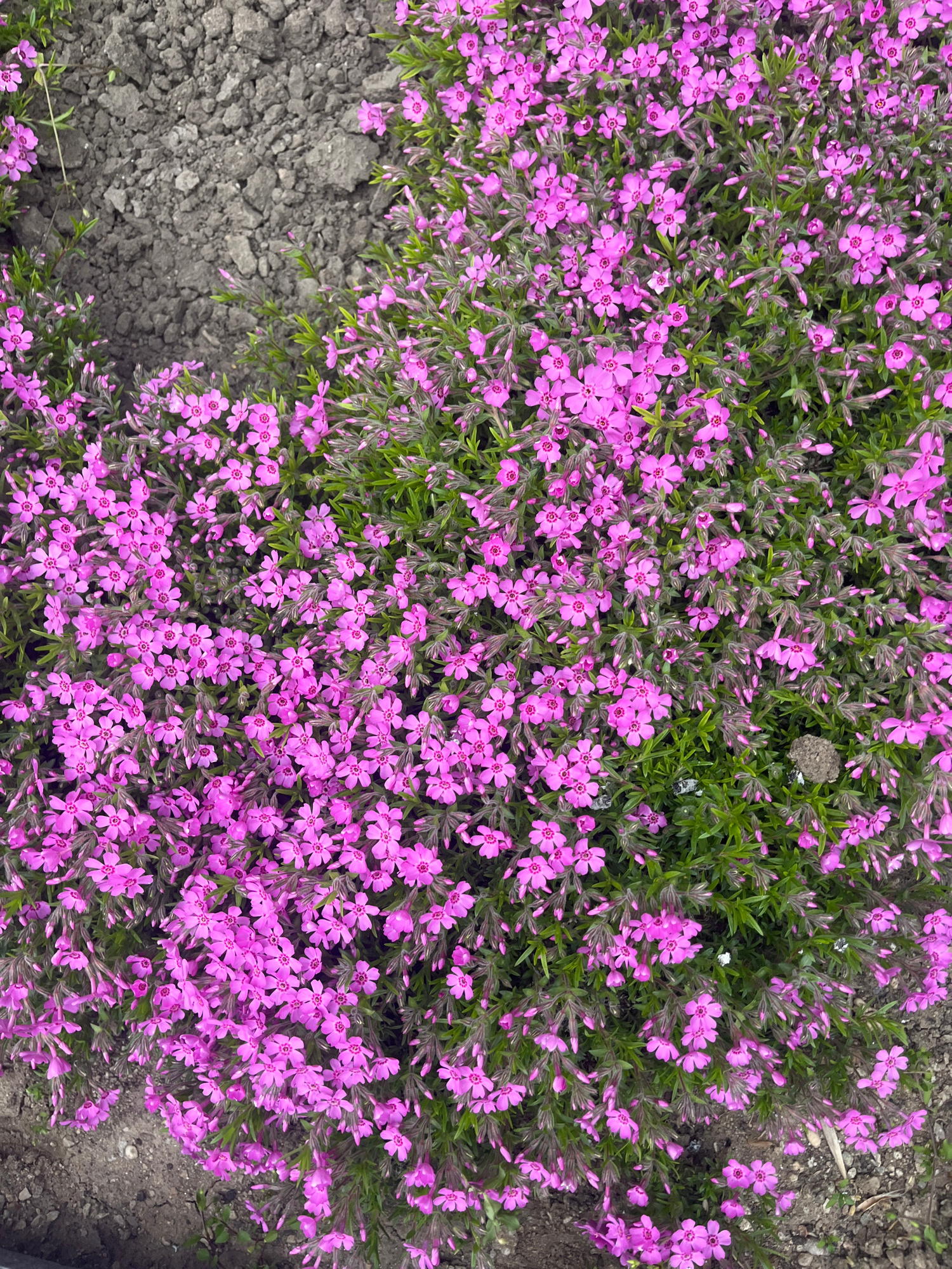 The image displays a dense patch of small, vibrant pink to purple flowers, covering most of the frame. These five-petaled blossoms feature a slightly darker center and are abundant, indicating a plant…read more