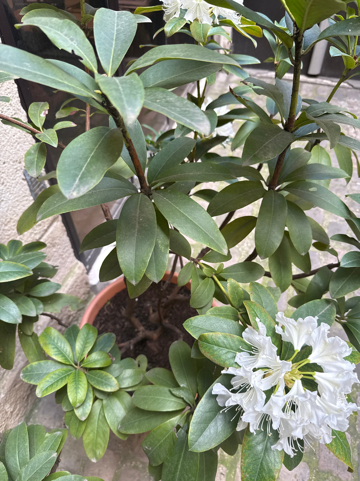 The image shows a close-up, high-angle view of a flowering plant with white blossoms and green leaves, likely a rhododendron, situated in a terracotta pot on a stone or concrete surface. The scene app…read more