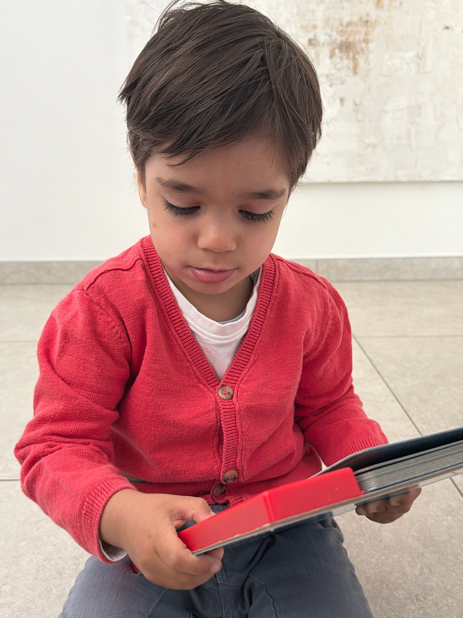 A high-angle, portrait-oriented shot, rotated 90 degrees clockwise, captures a young child intently focused on a book indoors in Junglinster, Luxembourg. The child, with dark hair and long eyelashes, is shown from the chest up, positioned on a light-colored, possibly tiled floor. Their eyes are cast downwards, suggesting deep concentration or peaceful engagement with the book. The child is wearing a vibrant red knitted cardigan with brown buttons over a white t-shirt, and blue-grey pants are visible from the waist down. Their hands gently hold an open book, which has a distinct red spine or cover. The pages of the book are visible between their hands. The background consists of a plain light-colored wall or surface, possibly with some subtle texture, creating a minimalist setting that keeps the focus on the child and the book. The lighting is bright and even, indicating daytime. No specific time of day or weather can be discerned. There is no visible text in the image. The overall impression is one of quiet learning or imaginative play. | Open Wire
