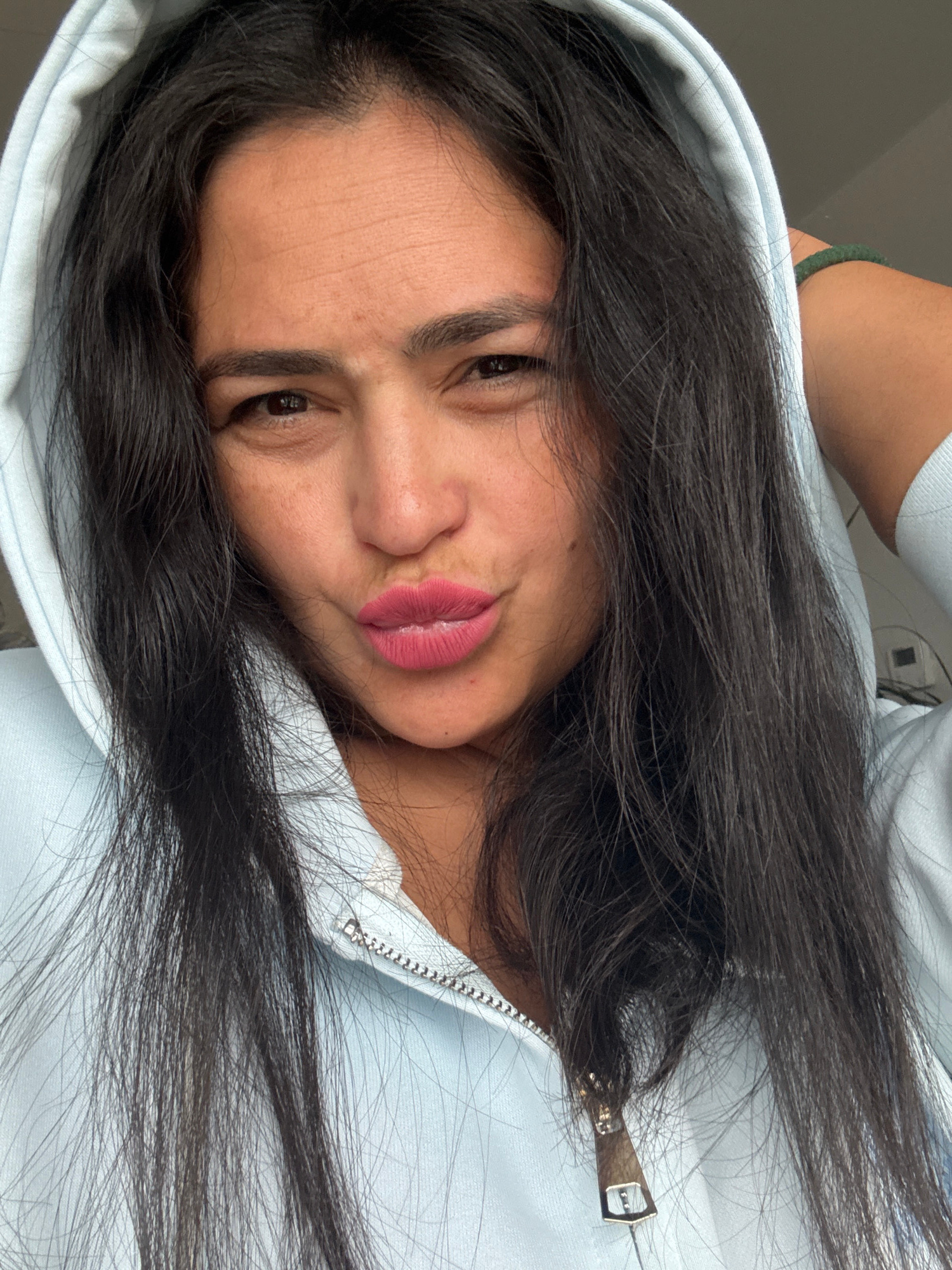 A woman with dark hair and light skin is lying down, wearing a light blue hooded sweatshirt. She is facing the camera with a slight smile. The scene is likely indoors and there are no other discernibl…read more