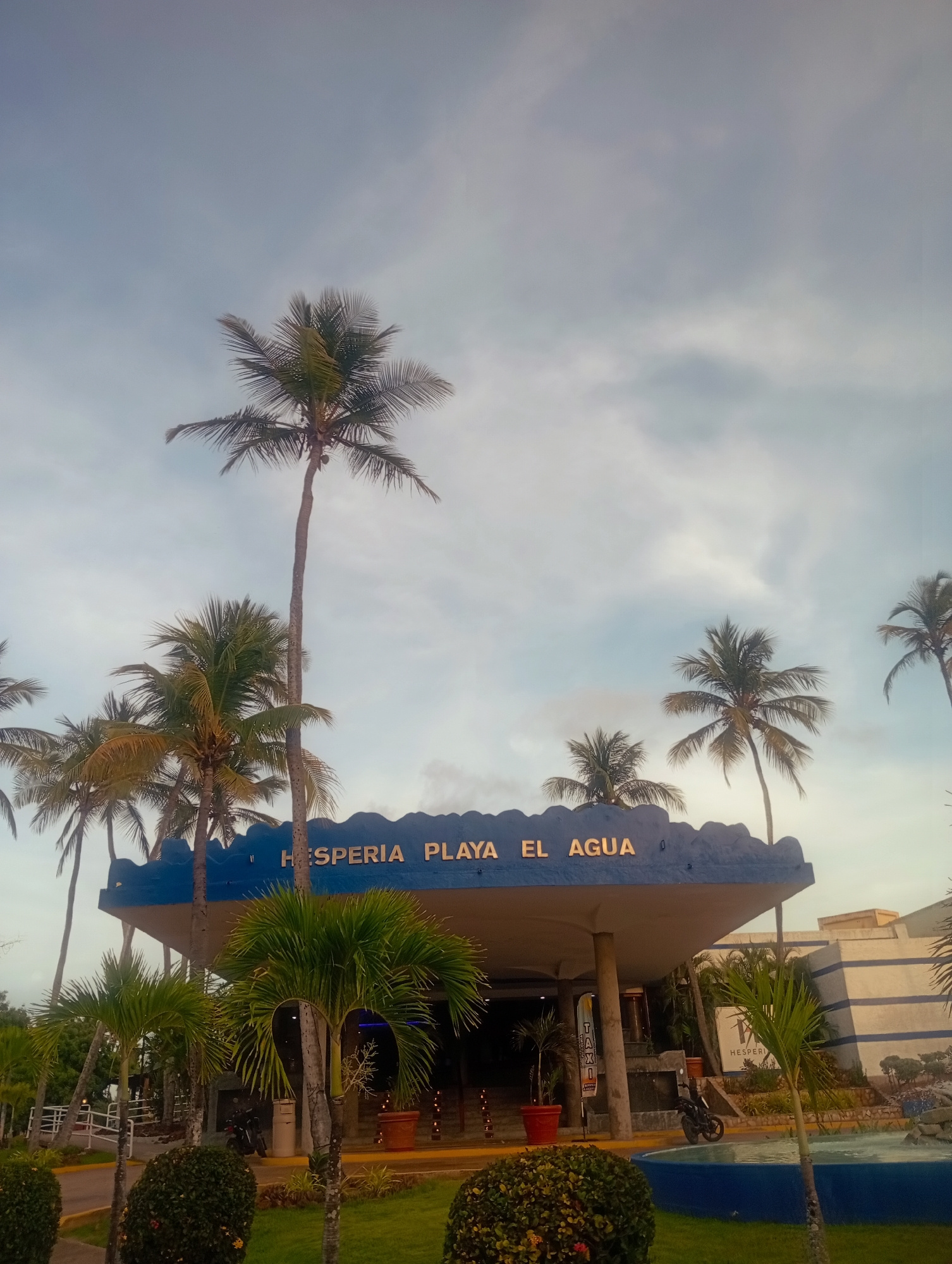 The image depicts the entrance of the Hesperia Playa El Agua hotel in Playa El Agua, Venezuela. The facade features a blue overhang with the hotel name prominently displayed. Palm trees are scattered…read more