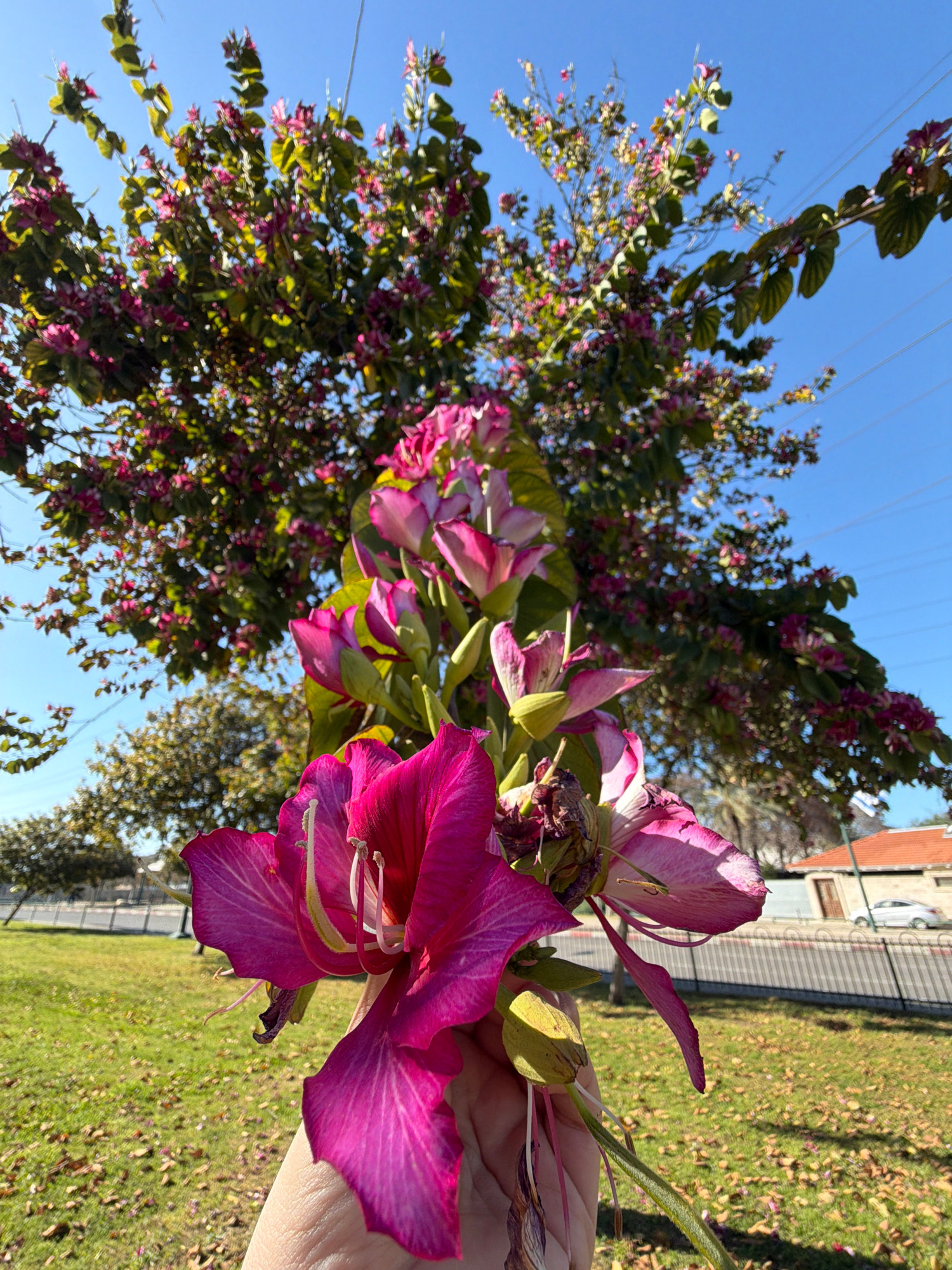 A close-up, low-angle photograph captures a human hand holding a cluster of vibrant magenta and pink *Bauhinia* (orchid tree) flowers in Tel-Aviv, Israel. The primary subject is the bouquet of blossom…read more