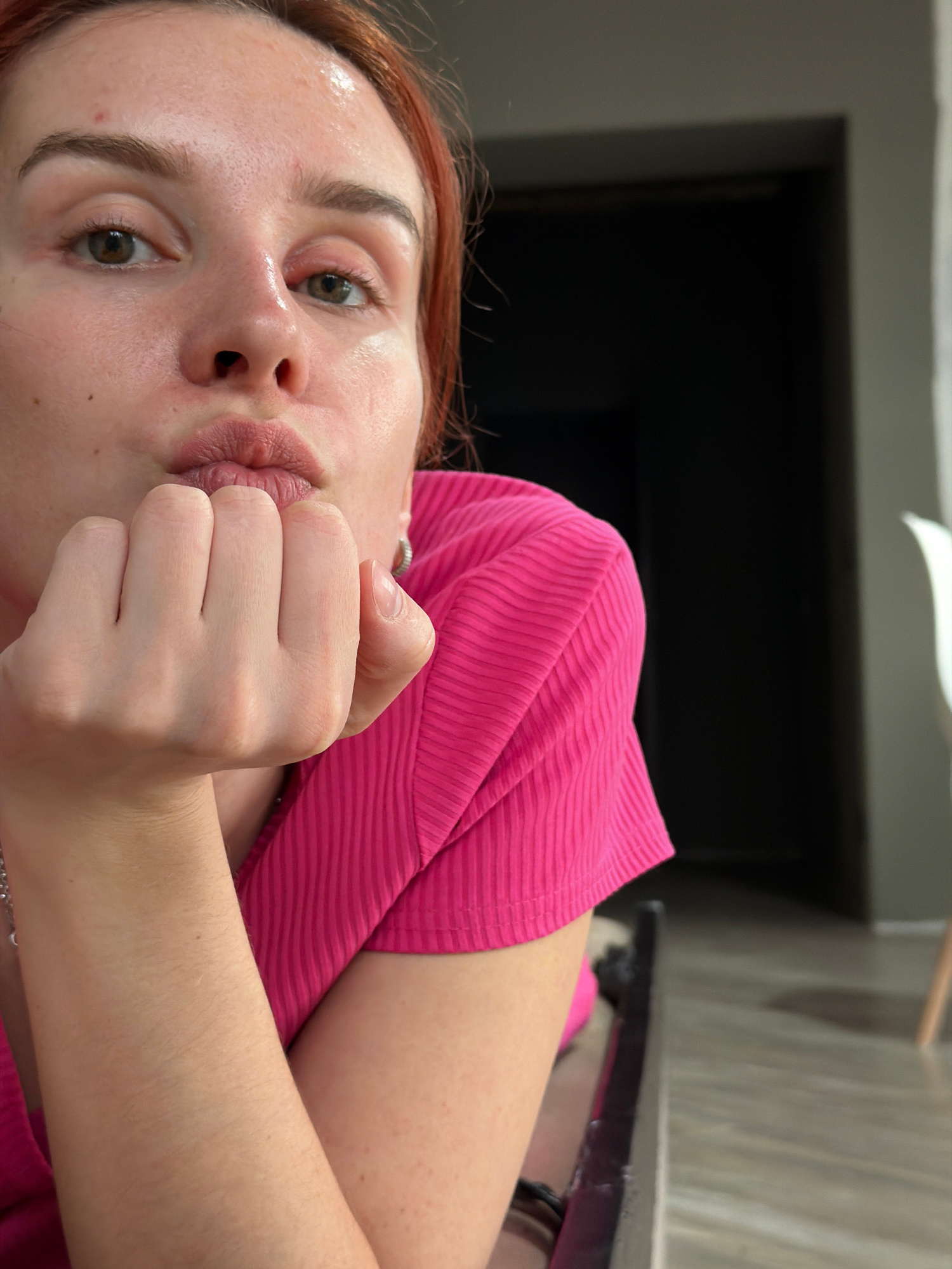 A close-up, rotated shot focuses on a light-skinned woman with reddish-brown hair. Her face has some shiny areas and visible pores. Her eyes are hazel, and she has relatively thick eyebrows. The woman…read more