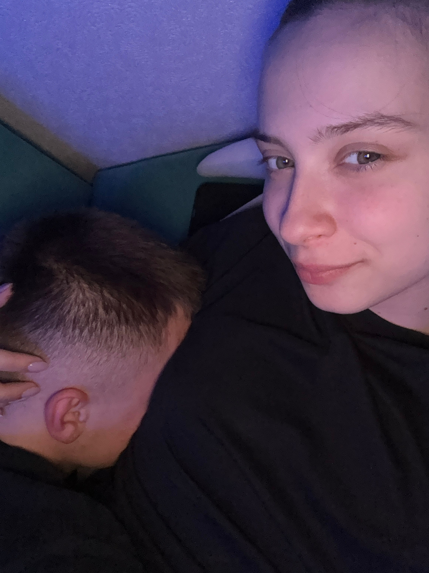 A selfie-style image shows a woman lying down with a man's head resting on her. The woman has fair skin, light brown eyes, and light eyebrows. She wears a dark-colored shirt. The man has short, dark h…read more