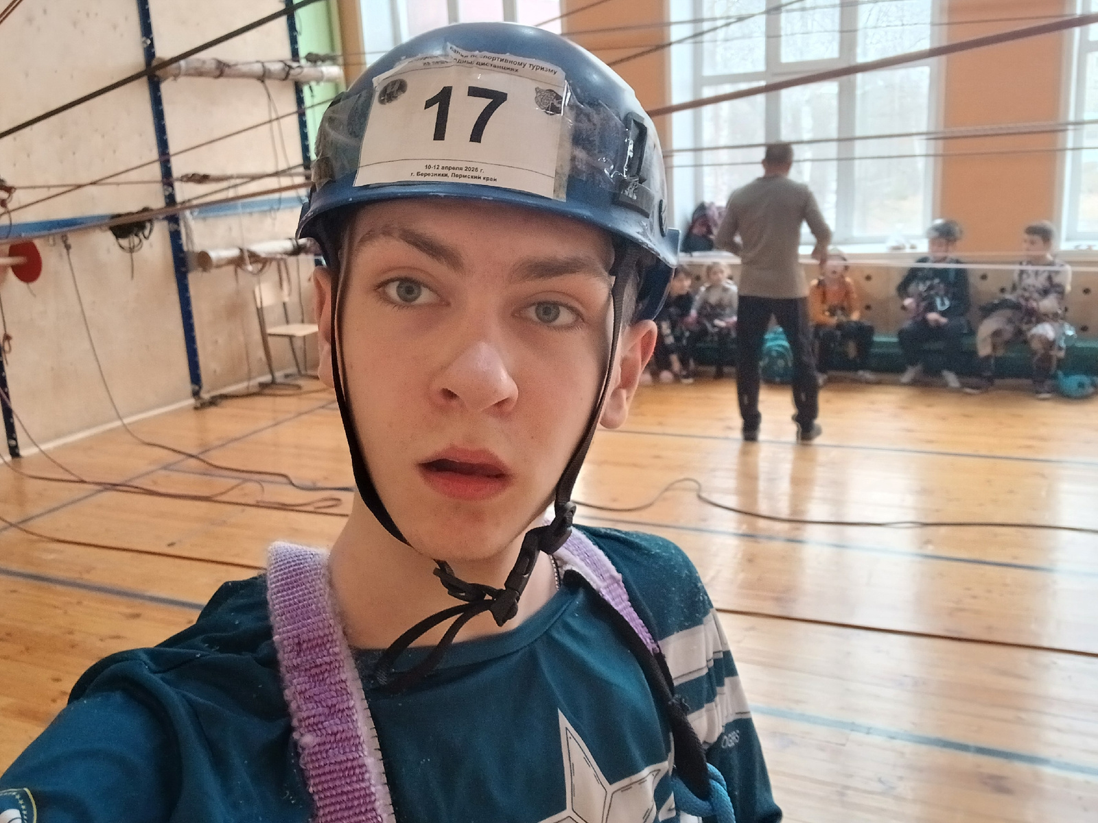 A young person is taking a selfie in what appears to be a gymnasium. They are wearing a blue helmet with the number "17" attached to the front, along with some text indicating a sports tourism event h…read more