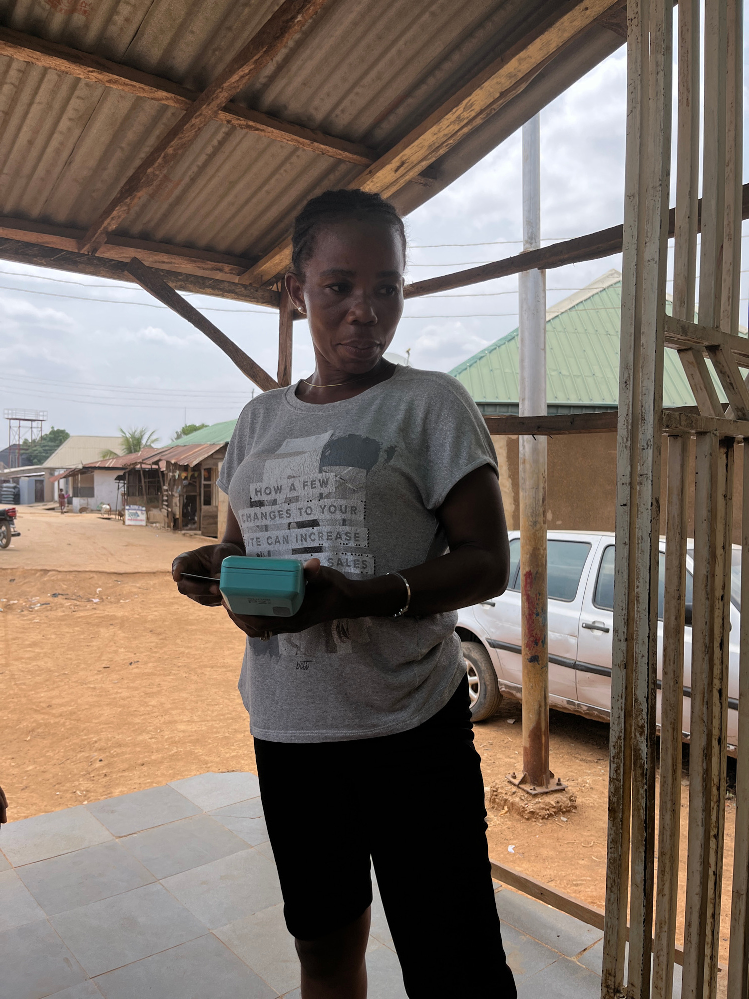 A woman stands in Madalla, Nigeria, holding a light blue portable device. She wears a gray t-shirt and black pants. The background includes a row of shops and a light-colored van. She is standing on g…read more