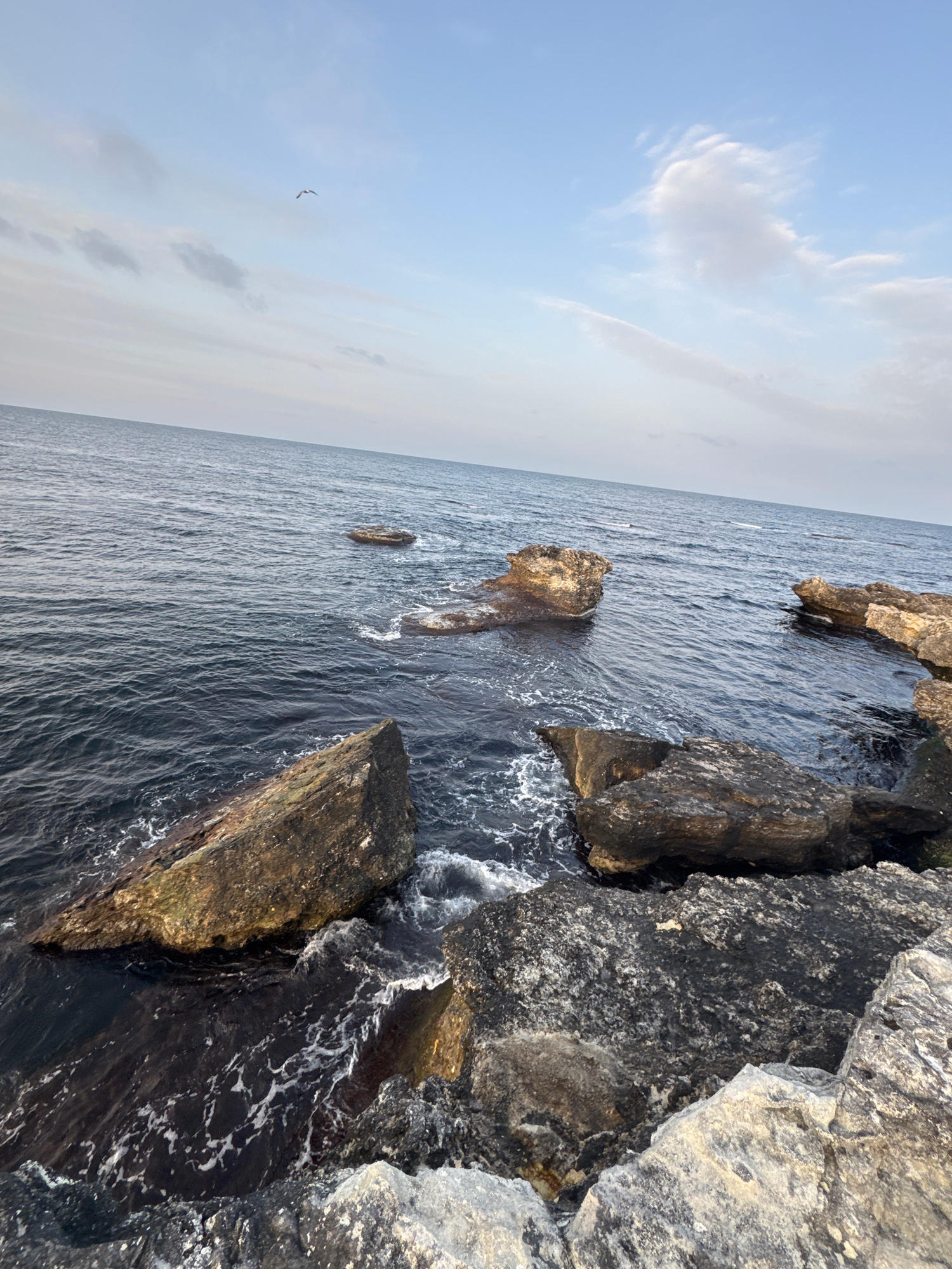 The photograph depicts a rocky shoreline on the coast of Tsarevo, Bulgaria. The water is dark and choppy, with waves breaking against the rocks. The rocks themselves are a mix of dark and light shades…read more