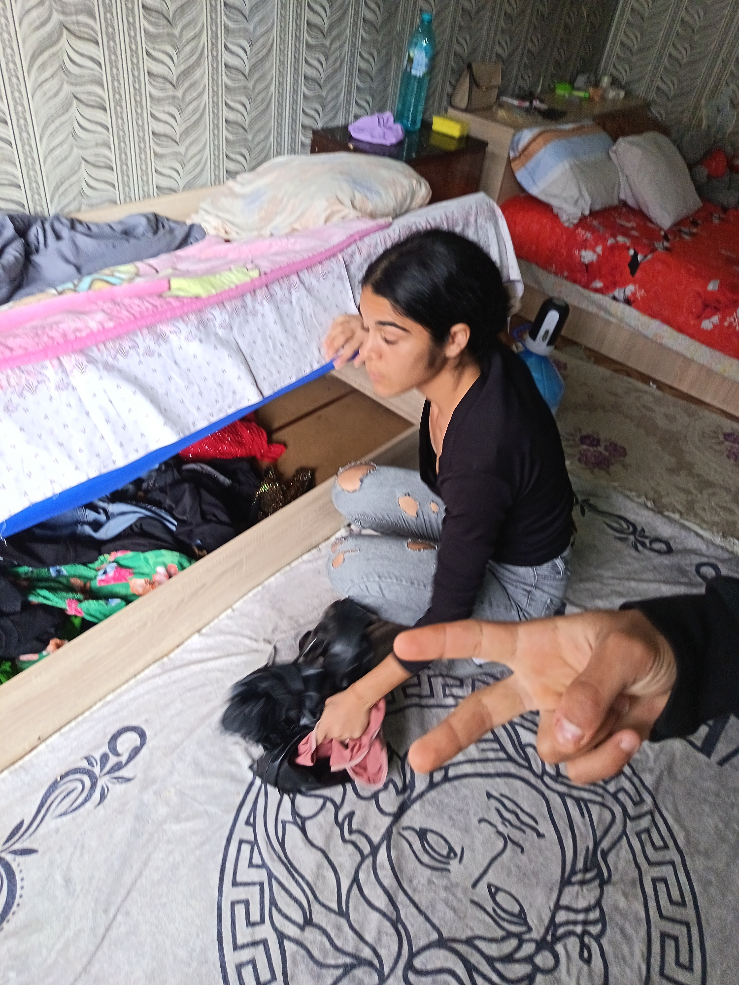 The image depicts a room with two beds, one with a pink-bordered white bedspread and a lower storage compartment filled with clothing. A woman with dark hair and wearing a black shirt and ripped jeans…read more