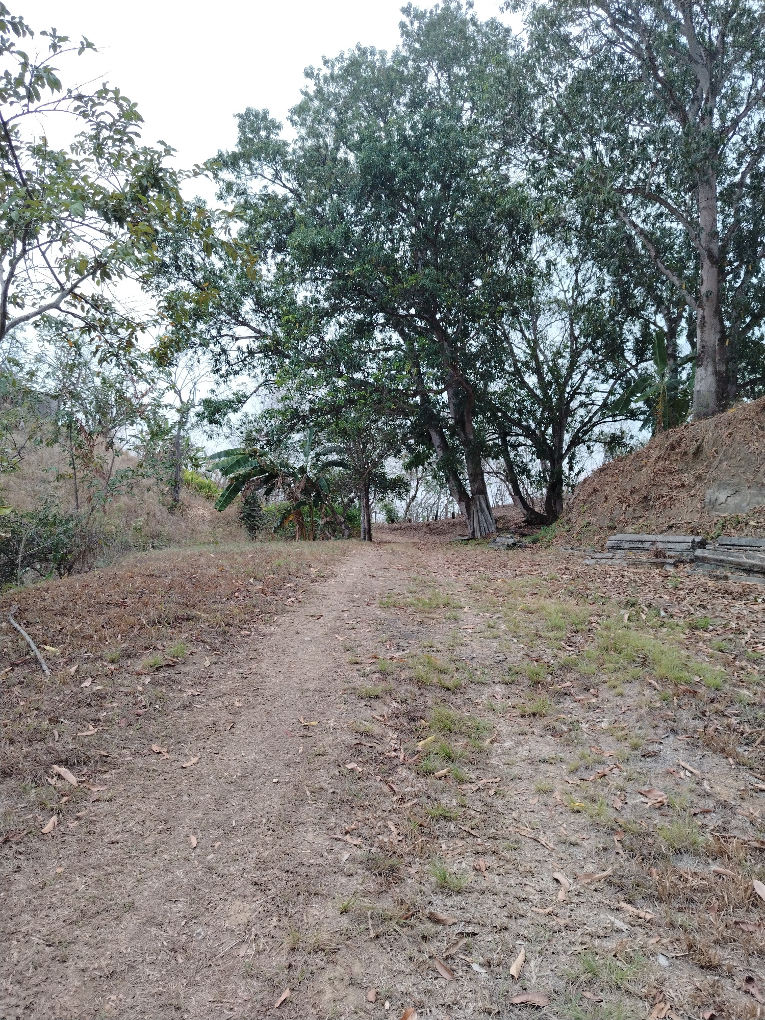 The image shows a dirt path in a wooded area. The path is covered in leaves and small patches of grass. Trees of varying sizes line both sides of the path. Some trees appear to be leaning towards the…read more