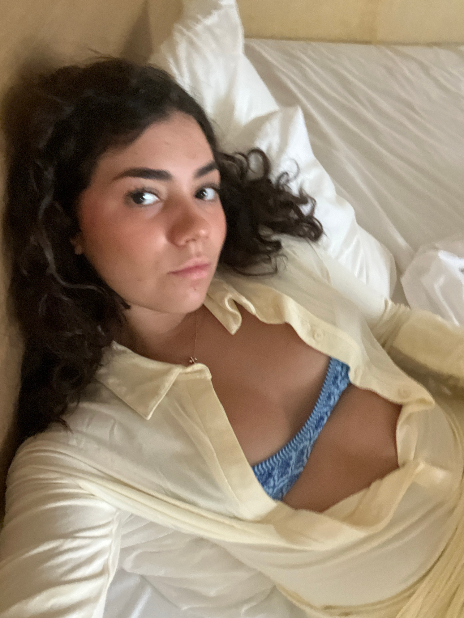 A woman with dark curly hair is lying on a bed in an indoor setting. She is wearing a light yellow, button-down shirt that is partially open, revealing a blue and white patterned top underneath. The b…read more