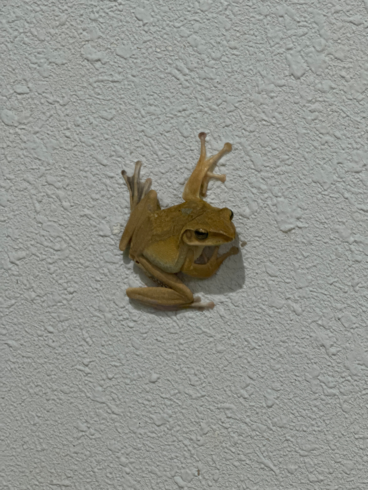 A light tan frog is clinging to a white textured wall. The frog has long legs and is positioned towards the center of the image. The wall appears to be an interior wall, and its texture is rough and b…read more