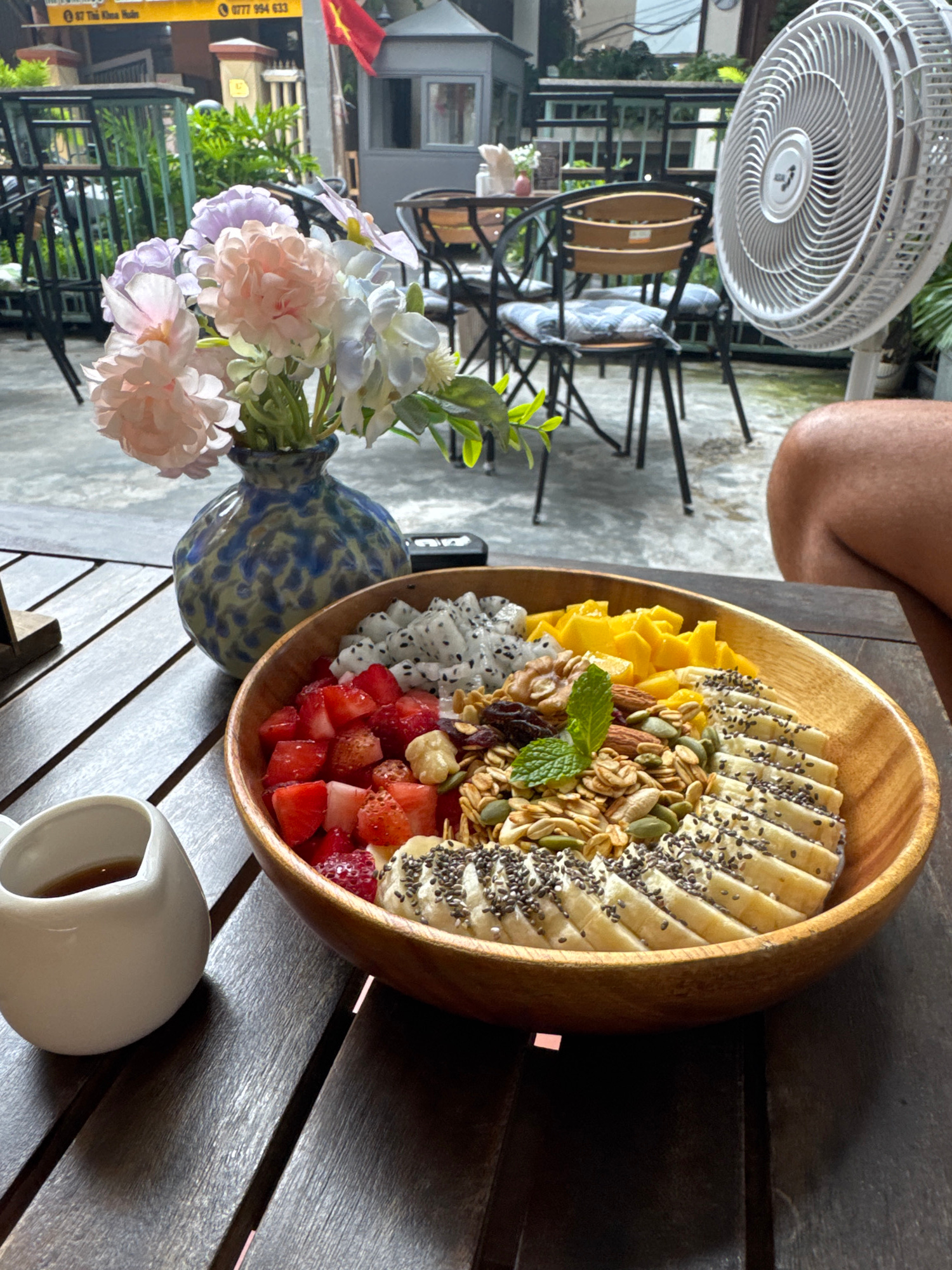 A wooden table in Đà Nẵng, Vietnam, is set with a wooden bowl containing sliced bananas, mango, dragon fruit, and strawberries, topped with granola and a sprig of mint. A white mug sits beside the bow…read more
