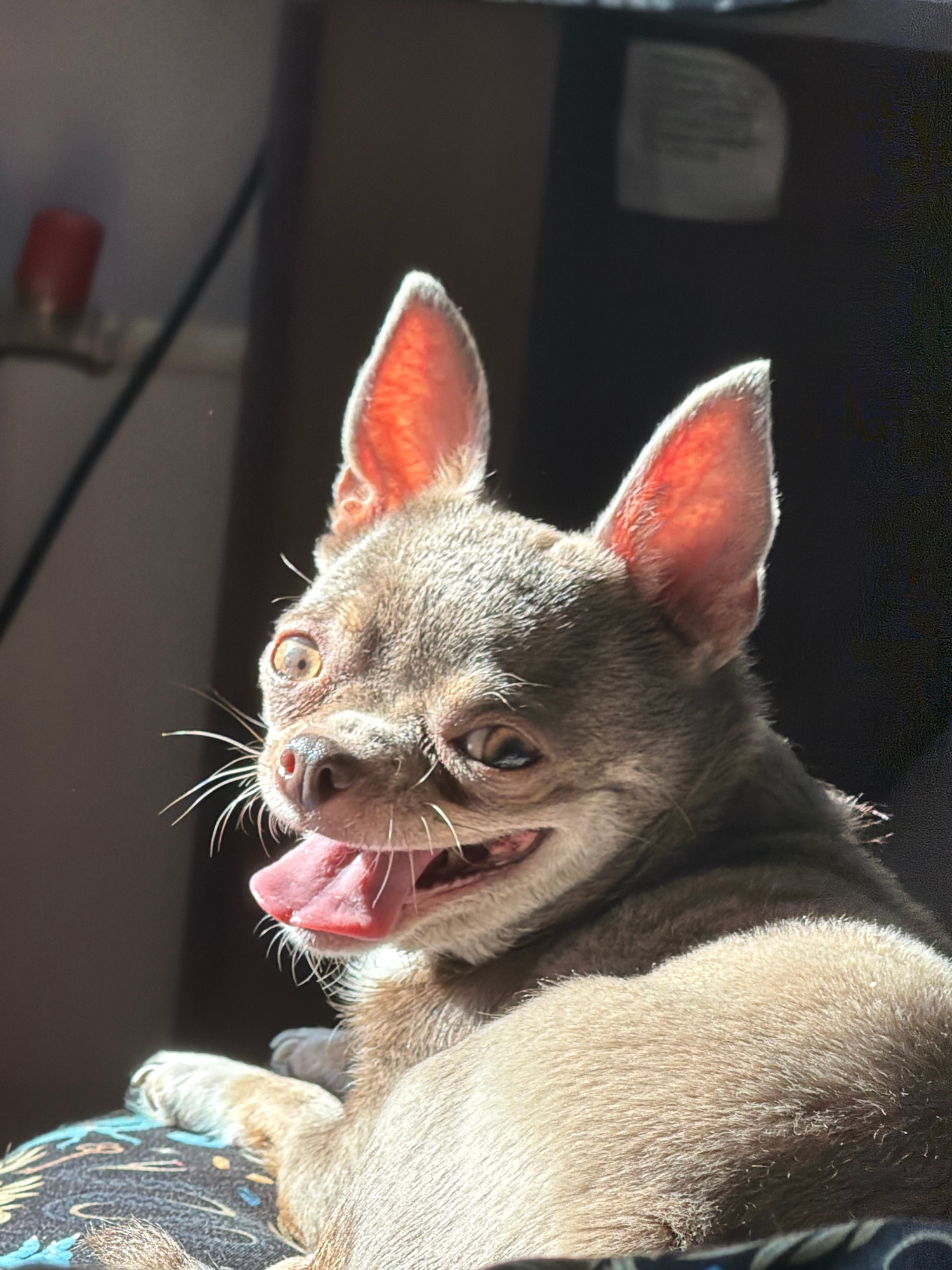 A tan Chihuahua dog with erect ears and a pink tongue hangs upside down. The dog's face is angled downwards, its mouth open in a yawn or bark. The fur is short and smooth, catching the light. A black…read more