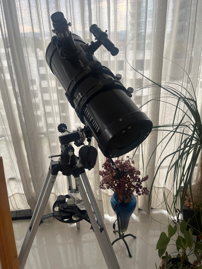 A black Celestron Seeker 127EQ telescope sits on a silver tripod. The telescope is pointed toward the left. Behind the telescope, a blue vase containing dried purple flowers is visible. A leafy greenβ¦read more