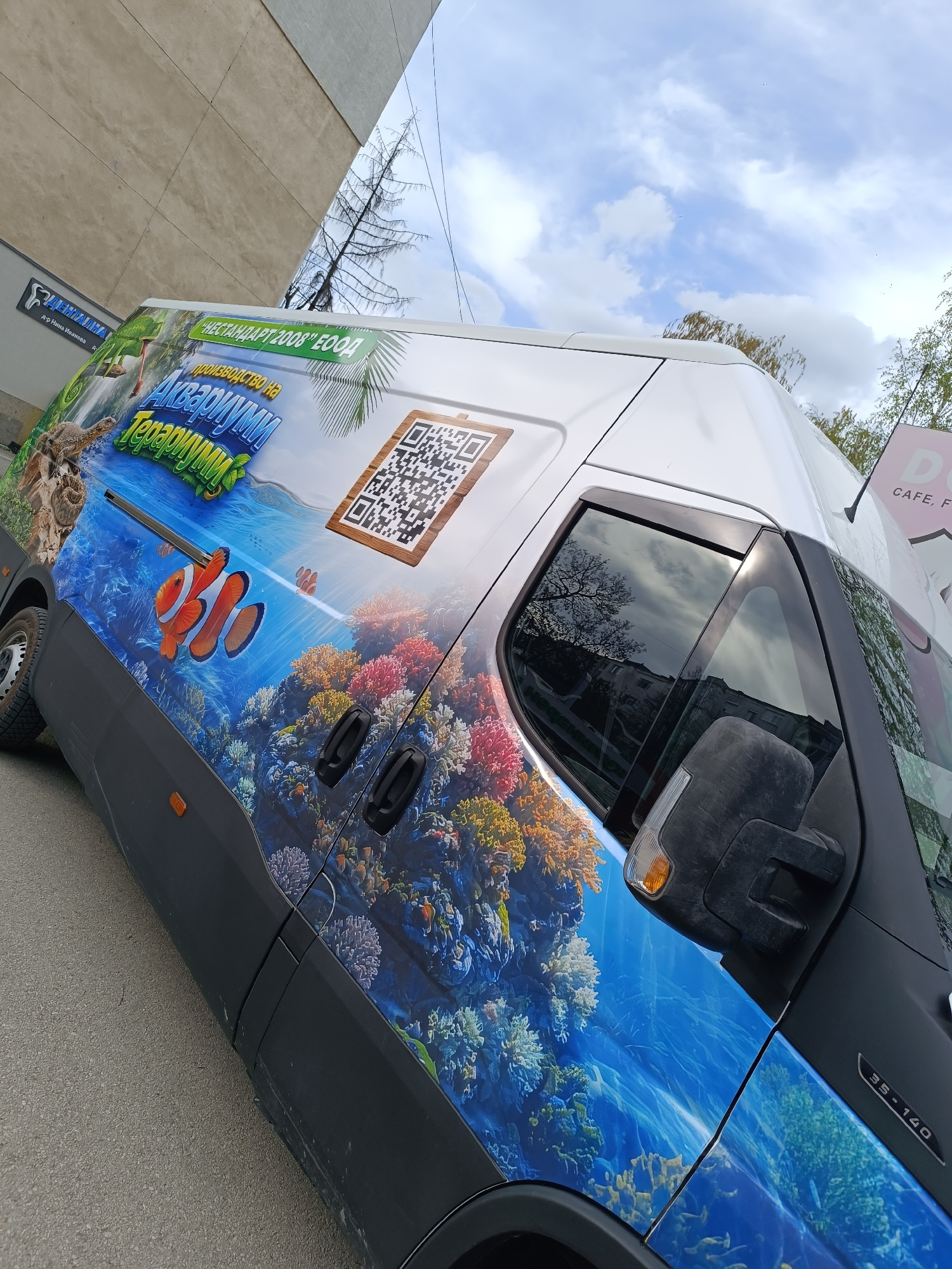 The image shows a van in Pleven, Bulgaria, with a large, vibrant advertisement for "Аквариуми Терариуми" (Aquariums Terrariums) printed on its side. The advertisement features underwater scenes with c…read more