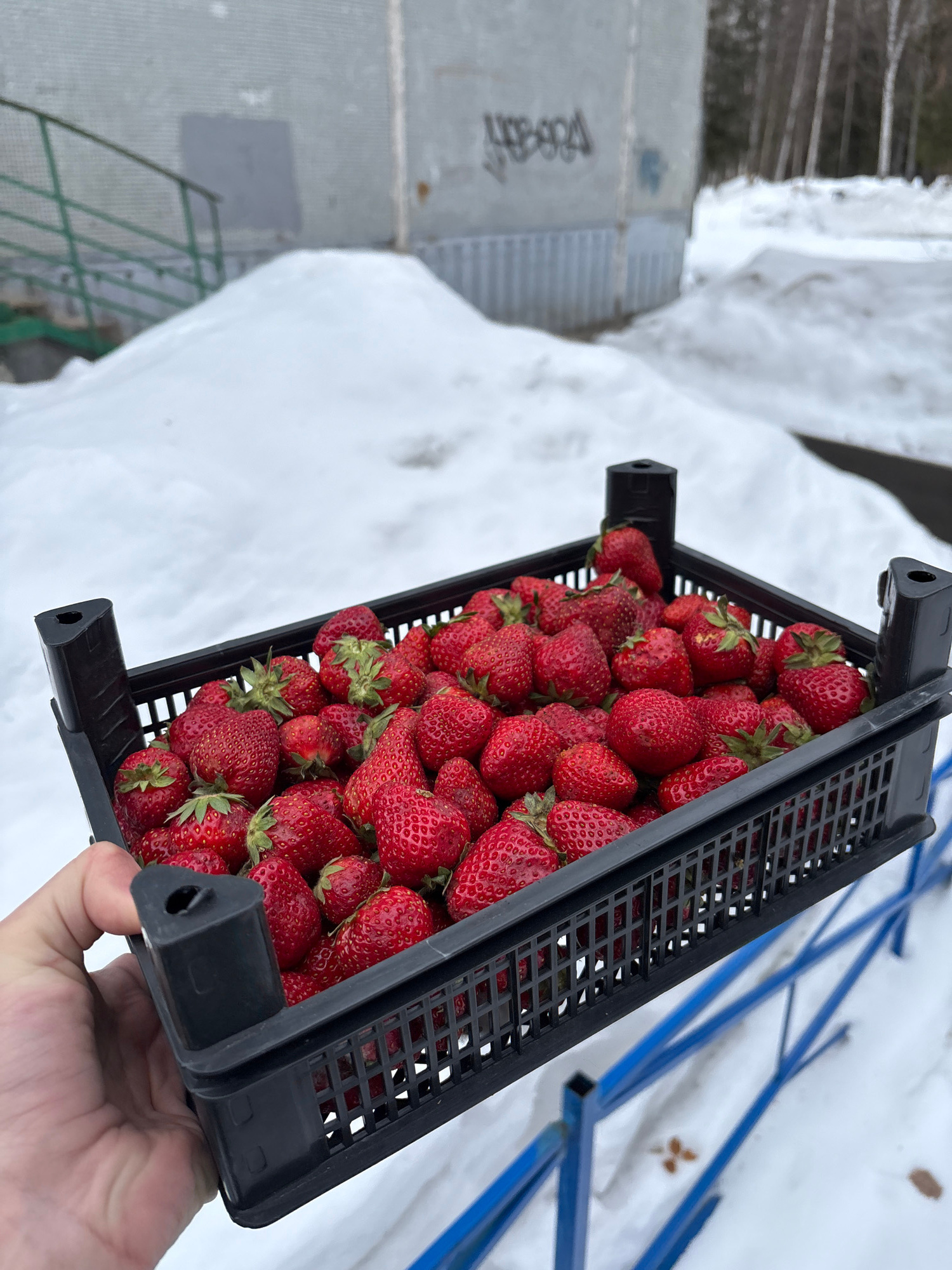 A high-angle, close-up shot shows a black plastic crate filled with fresh strawberries, held by a person's hand. The strawberries are vibrant red and plentiful, filling the crate. The background revea…read more