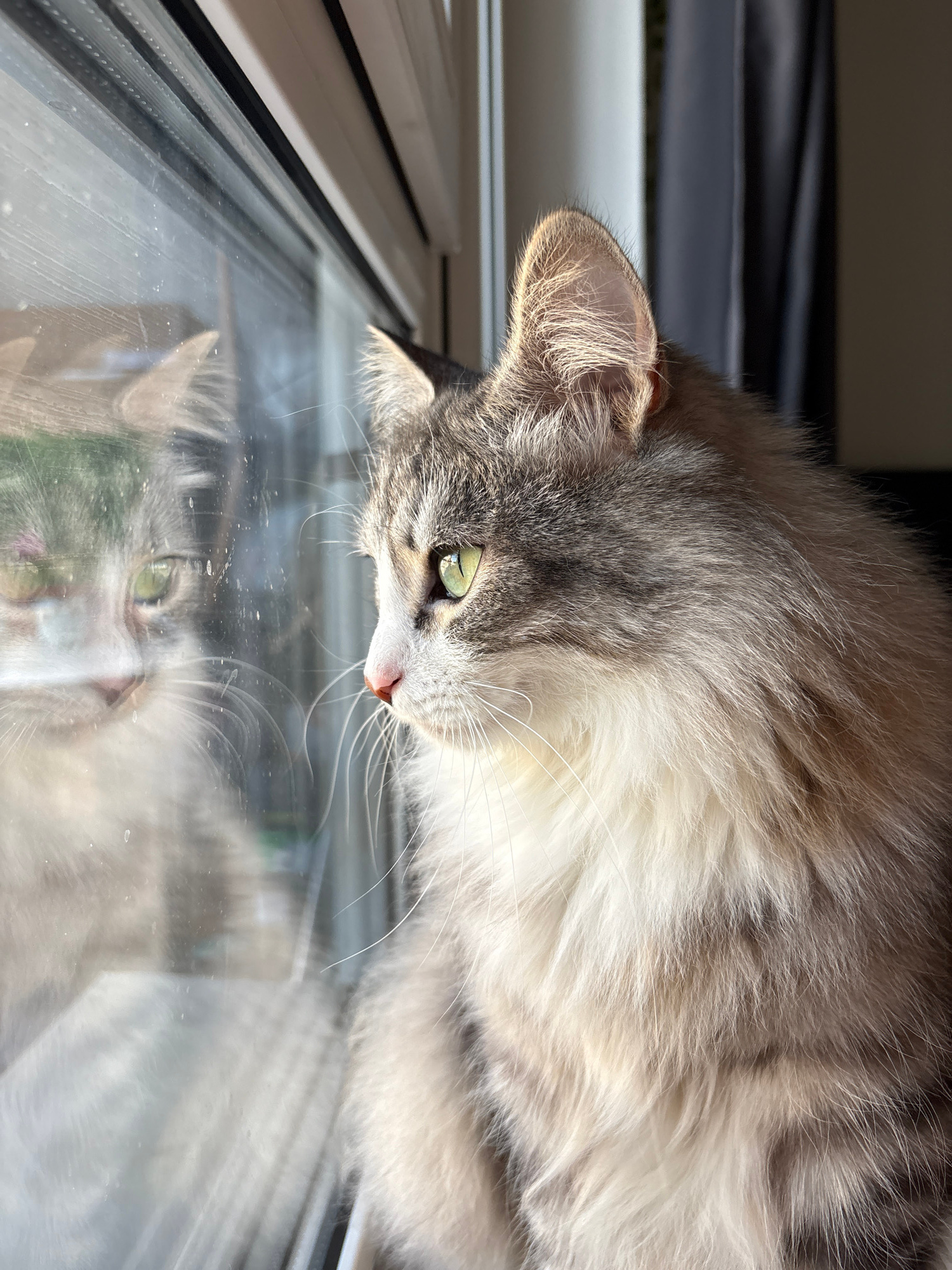 A fluffy gray and white cat is looking at its reflection in a glass surface, likely a window. The cat's face, including its green eyes and pink nose, is clearly visible, along with its whiskers. The r…read more