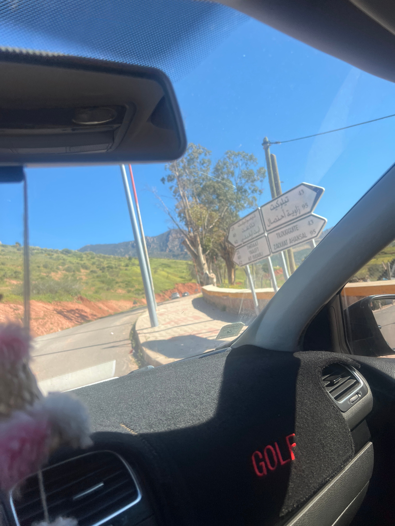 Captured through the windshield of a Golf brand vehicle, the image reveals a sunlit, outdoor scene in the city of Ouaouizert, Morocco. A road sign points to locations, reading: Tilougguite (43), Takaf…read more