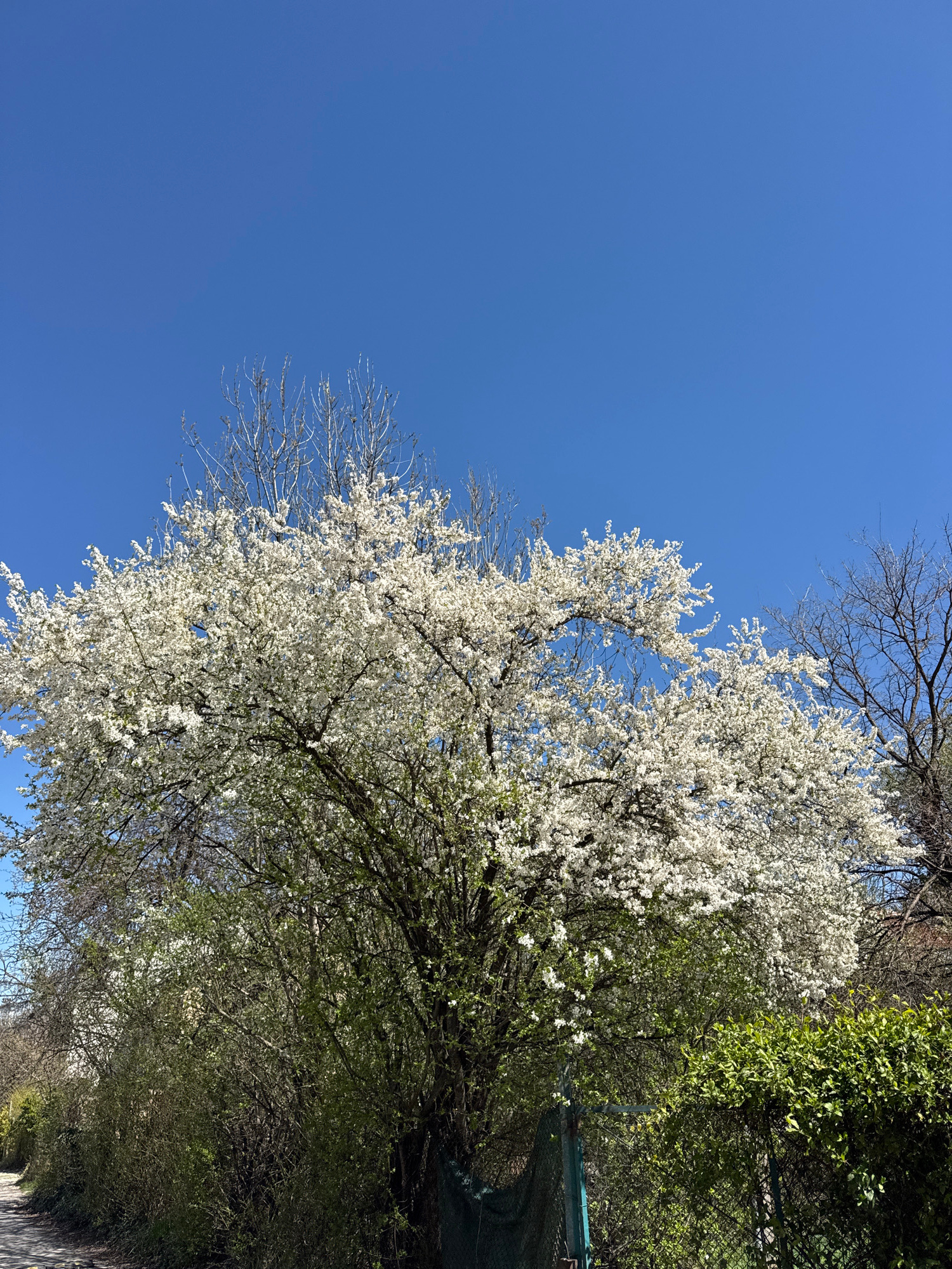 The image shows a blossoming tree in what appears to be a park or green space. The tree is covered in white flowers, suggesting it is springtime. A bright blue sky is visible in the upper left cornerβ¦read more