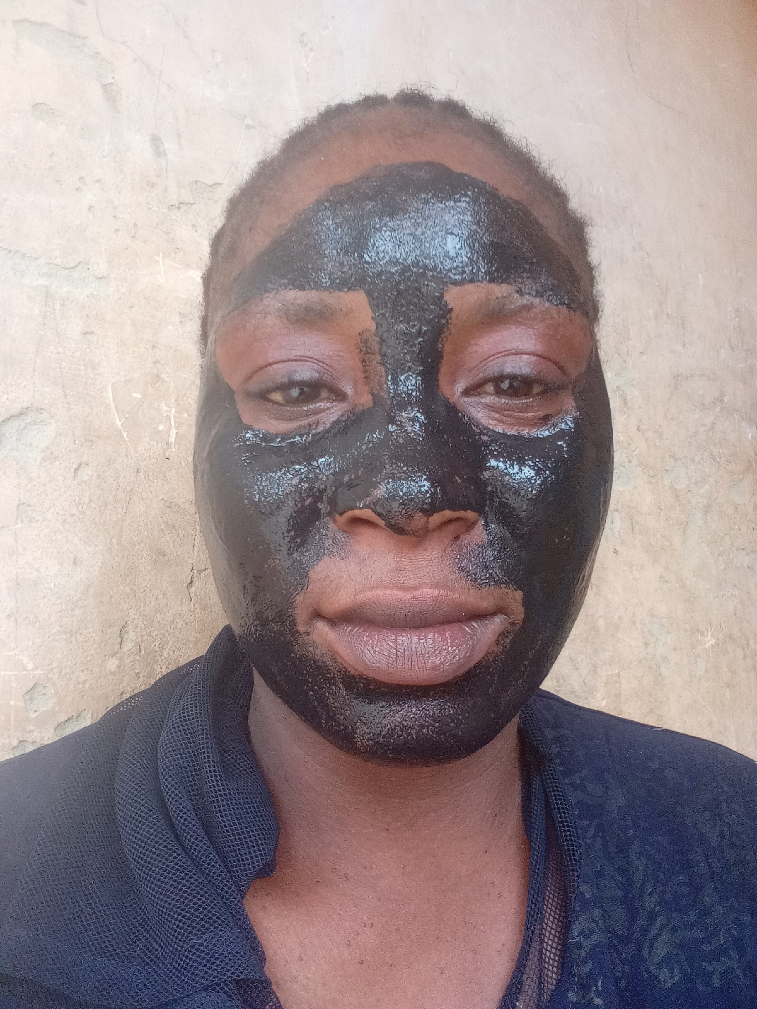 A close-up photo shows a person's face covered with a black facial mask, set against a textured, off-white wall. The person's hair appears dark and cropped close to the scalp. The mask covers most of…read more
