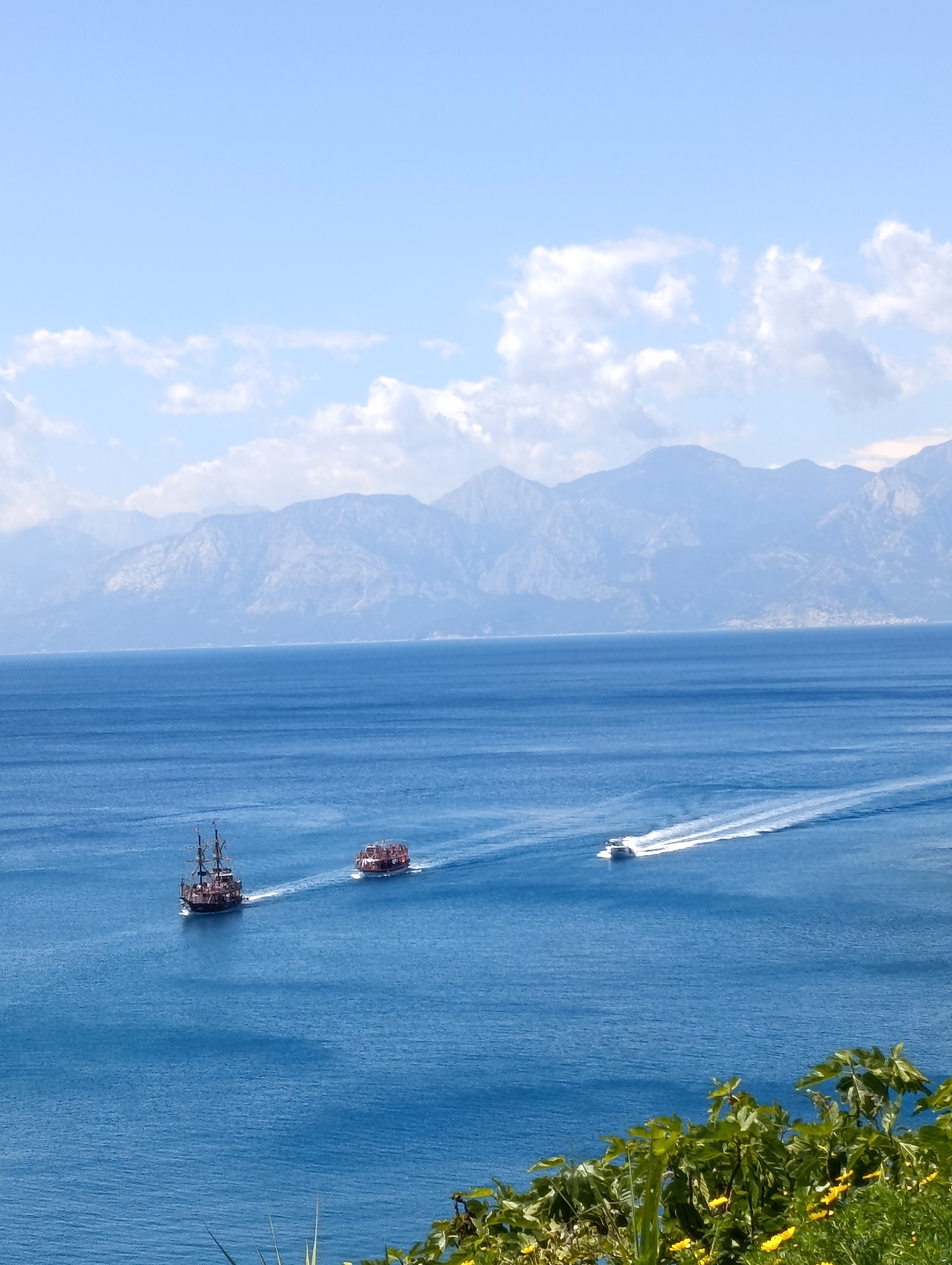 The image shows a view of the Mediterranean Sea off the coast of Antalya, Turkey. The sea is deep blue, with visible wakes from three boats. The boat on the left is a tall ship with dark sails. To its…read more
