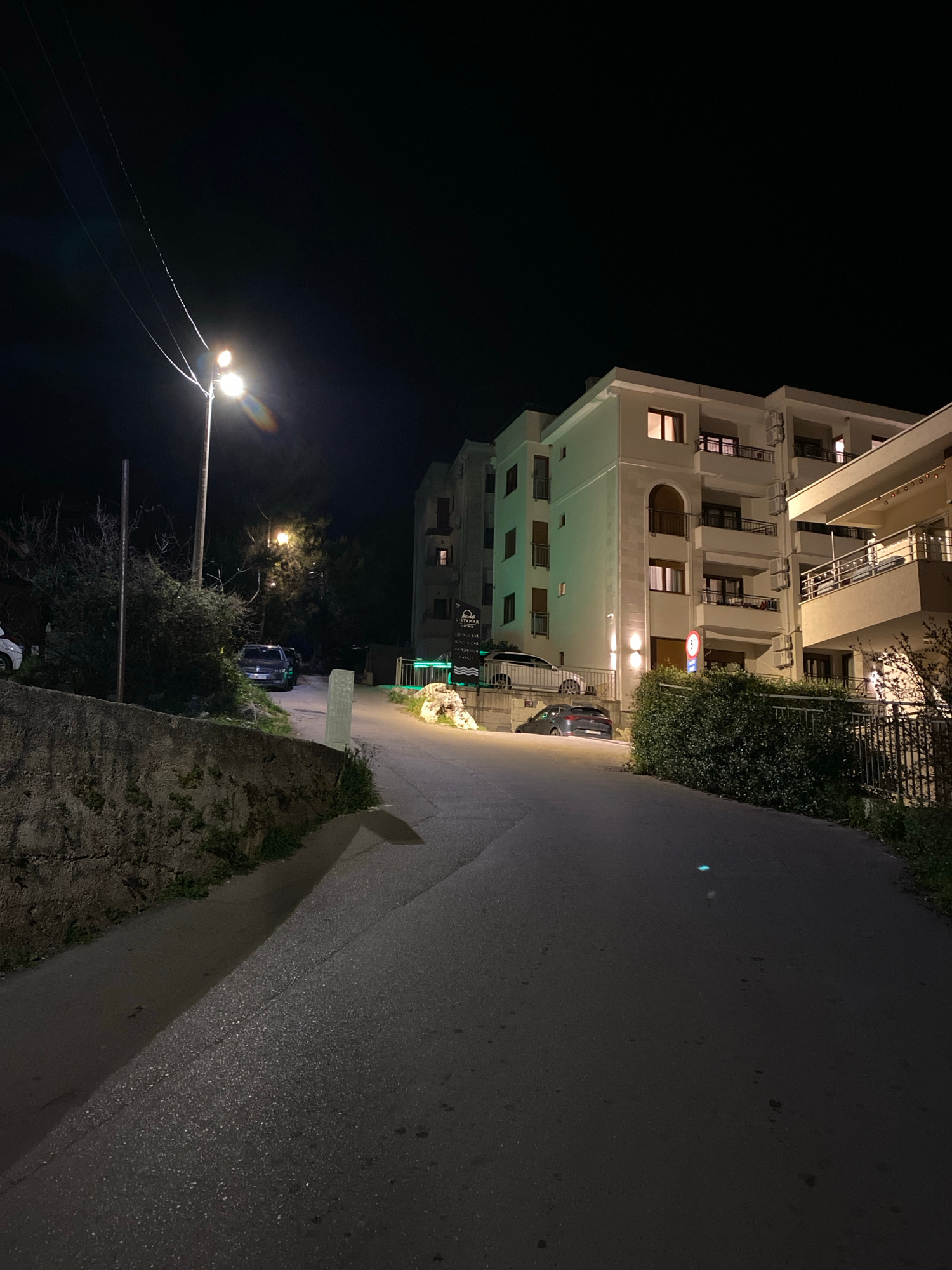 The image shows a street scene at night in Budva, Montenegro. A tall, light-colored building with multiple floors and balconies dominates the left side of the frame. The building is illuminated with w…read more