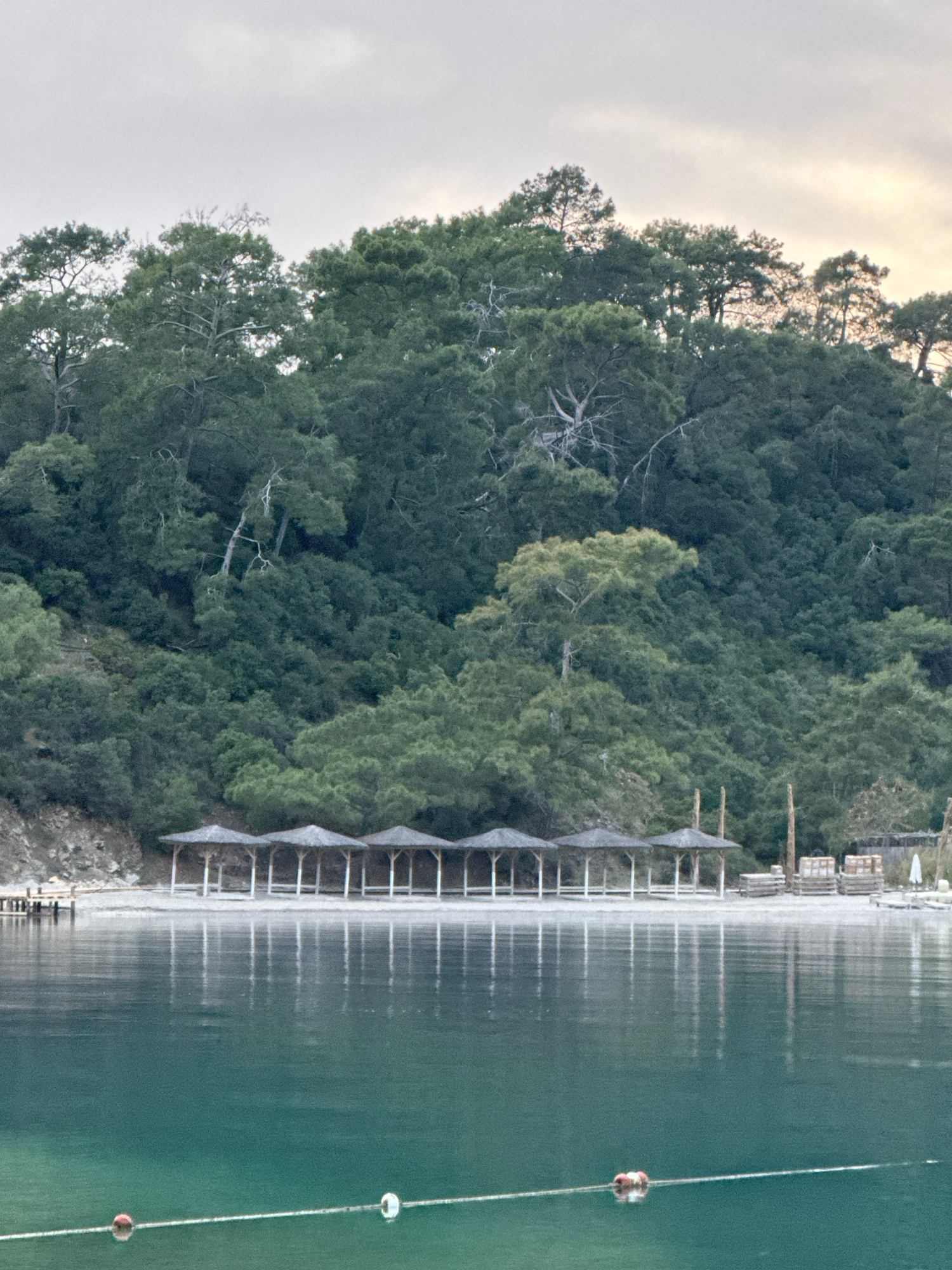 This image presents a tranquil coastal landscape in Fethiye, Turkey, under an overcast sky. The scene is dominated by three horizontal bands: a dense forest, a strip of beach with structures, and a ca…read more