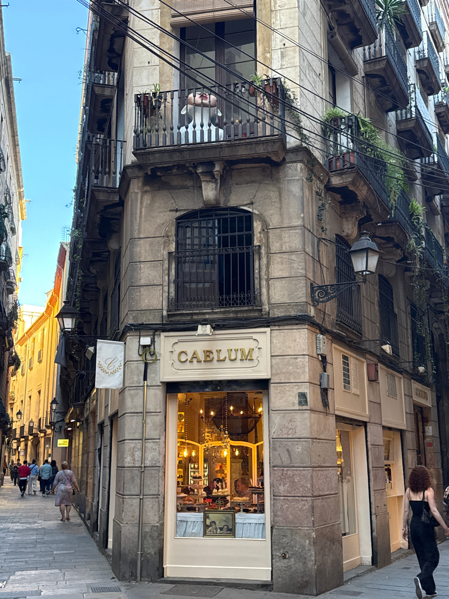 The image depicts a street scene in Barcelona, Spain. The focus is on an old building with a shop called "Caelum" on the ground floor. The architecture is characterized by stone facades, balconies witβ¦read more